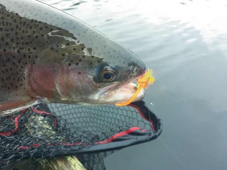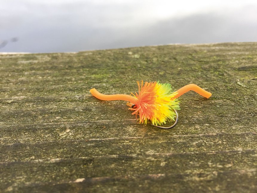 C’est un pêcheur en réservoir breton qui m’a donné envie d’en monter car il avait eu de bons résultats avec ce type de modèle. L’idée est de monter un blob avec deux pattes en squirmy worm assorti à la chenille blob. Les pattes bougent beaucoup dans l’eau et excitent les truites qui n’ont pas l’habitude de voir ce genre de mouche.