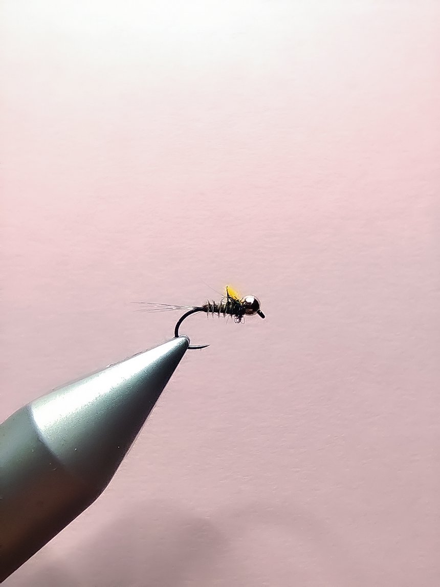Cette petite nymphe est idéale à monter en potence sur un train de deux nymphes. Elle représentera parfaitement une petite nymphe d’éphémère et notamment de Baetis, espèce bien présente en début de saison. Le petit tag orange sur le thorax ajoute une pointe incitative au côté imitatif de cette mouche.
