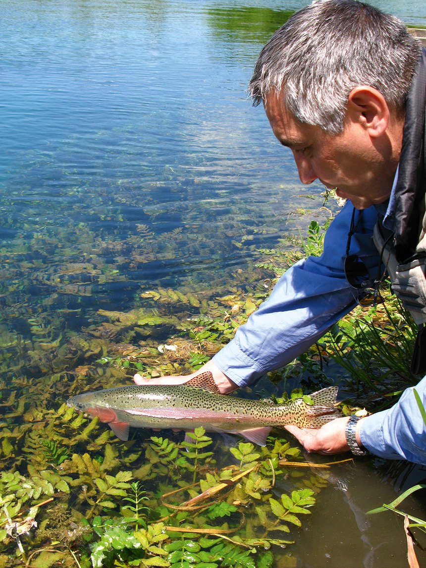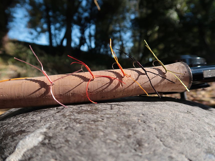 Depuis que j’ai découvert les Apps, je les utilise de deux façons, soit en mode « slow fishing » soit en mode « pompon ». Dans les deux cas, je joue avec mon kit réservoir favori, composé d’une canne de 10 pieds associée à une soie de 6 flottante. Le bas de ligne est une queue-de-rat de 3,60 m se terminant en 18/100 sur laquelle je fais une micro-boucle. Dans le premier mode, j’utilise une pointe en 14/100 de 2 m de long avec soit un Apps en solo ou alors avec un second de teinte différente placé en potence à 1 m de celle de pointe. En action de pêche, je m’applique à faire un lancer permettant de poser soie et bas de ligne tendus dans le même axe que la canne, pour finir pointe du scion immergé juste sous la surface. Je laisse ensuite la ou les mouches descendre à la profondeur choisie, sans animation, tout en gardant le contact ligne tendue afin de pouvoir capter une touche. Vont ensuite commencer les phases d’animations, vitales pour inciter les farios ou arcs croisant dans le secteur à se mettre en colère et attaquer. Traction longue, traction rapide continue, entrecoupée de pauses plus ou moins longues, tricotage façon chiro, déplacement en zigzag effectué au scion, tout est bon dans l’animation… Avec une dose d’imagination, d’improvisation, d’adaptation à l’activité des poissons. Les touches sont le plus souvent rageuses, voire violentes, il suffit de relever la canne pour assurer le ferrage et d’avoir le frein du moulinet bien réglé afin d’éviter une casse dès le premier rush d’un beau poisson. En mode « pompon », je fixe à la micro-boucle un porte pointe en 18/100 de 1 m, sur lequel je fixe un pompon indicateur de touche, réalisé avec une mèche de yarn indicator orange fixé par un nœud à pompon. La pointe de 1 à 3 m en 14/100 sera fixée au porte pointe par un nœud du chirurgien. Avec ce montage, je n’utilise qu’un seul Apps afin d’optimiser les longs lancers et ainsi avoir de longues amplitudes de dérive. Je privilégie ce montage pour les pêches en dérive inerte « au vent » lorsque la surface est balayée par Eole, si celui-ci est faible, je rajoute quelques animations variées pour assurer l’attractivité de l’Apps. Quel que soit le mode utilisé, il est bon de vérifier régulièrement les mouches afin de s’assurer qu’il n’y a pas emmêlage de pattes…