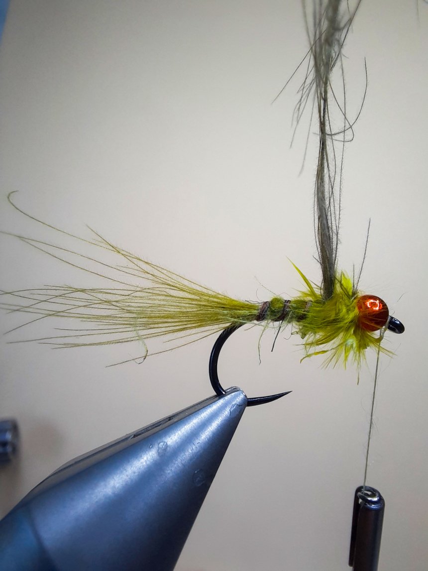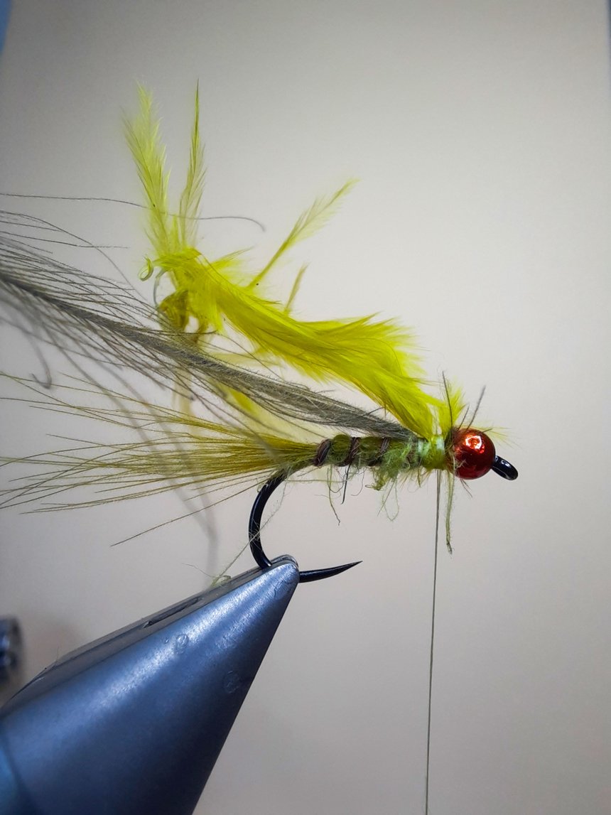 Cette mouche est née sur le bord d’un grand lac du Massif central où j’ai eu la chance de vivre une éclosion fantastique de « Danica ». Ce jour-là, il fallait donc pêcher les zones de limons, au plus près de la berge, en posant la mouche dans les joncs. Les nymphes classiques ne fonctionnaient pas, il fallait que ça nage ! En dépouillant un petit streamer, j’ai obtenu une première ébauche de cette mouche qui, depuis, a évolué et ne quitte plus ma caisse de pêche en lac (ni ma boîte de pêche à vue…) !