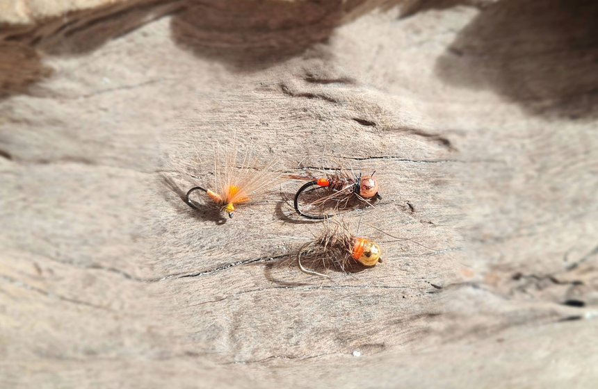 J. M. : Mes mouches préférées sont en sèche la « tout lièvre », une oreille de lièvre flottant dans la pellicule, et les CDC ailes en V que je monte dans de nombreuses tailles et couleurs. Je leur mets un petit toupet orange entre les ailes pour augmenter la visibilité. Cette mouche est un classique en Espagne, mais marche aussi parfaitement chez nous ! Au niveau des nymphes, j’utilise principalement une oreille de lièvre avec des cerques en pardo, un corps en lièvre et une ligature en fil de montage orange derrière la bille. Un autre de mes modèles préférés est une nymphe avec des cerques et un corps en chevreuil, un tag en fil rouge et un dubbing en phoque naturel derrière la bille. J’utilise aussi des perdigones dans certaines situations, notamment une variante de la fameuse « gazoline ».