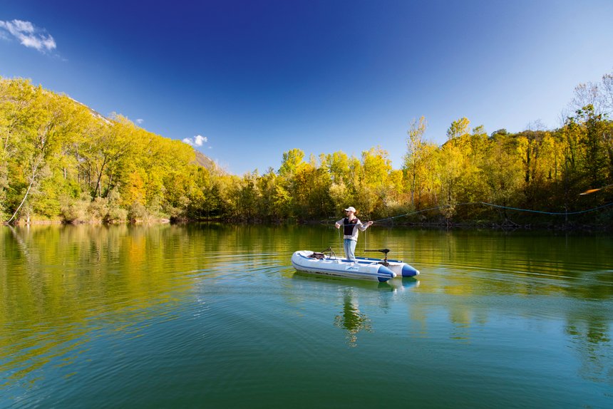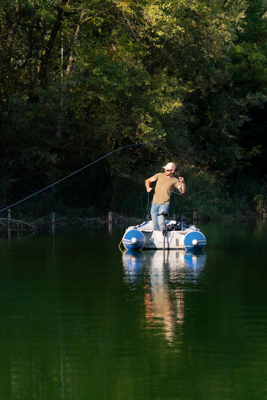 La superficie du plan d’eau est de 3 hectares et la profondeur moyenne de 2 mètres, avec quelques « fosses » à 4 mètres. Les berges sont souvent profondes, très arborées et nombre de branches plongent dans l’eau. Par expérience, je sais que les brochets peuvent alternativement se trouver en pleine eau, zone souvent occupée par le poisson fourrage, ou au contraire rester en bordure, sous l’abri végétal. C’est convenu, je peignerais la partie centrale aux leurres et lui ratissera les bordures à la mouche. Will positionne son bateau à une trentaine de mètres des berges, d’une part pour une question de discrétion et, d’autre part, pour lui permette de réaliser de longs lancers en éventail couvrant une large surface. L’action est fluide, précise, et l’absence de vent, certes peu propice à l’activité des carnassiers, apporte une aide appréciable. Le streamer se pose à un ou deux mètres de la bordure. William lui laisse le temps de descendre lentement dans la couche d’eau, aidé en cela par la soie intermédiaire qui assure le lest nécessaire. Ensuite, l’animation consiste à effectuer quelques tirées sèches afin de simuler une fuite, puis quelques secondes d’immobilité qui permettent au leurre de redescendre vers le fond. Lors de cet arrêt, les fibres se gonflent et donnent une impression de vie indiscutable. Néanmoins, le temps passe et ne nous apporte pas, ni à l’un ni à l’autre, les résultats escomptés.