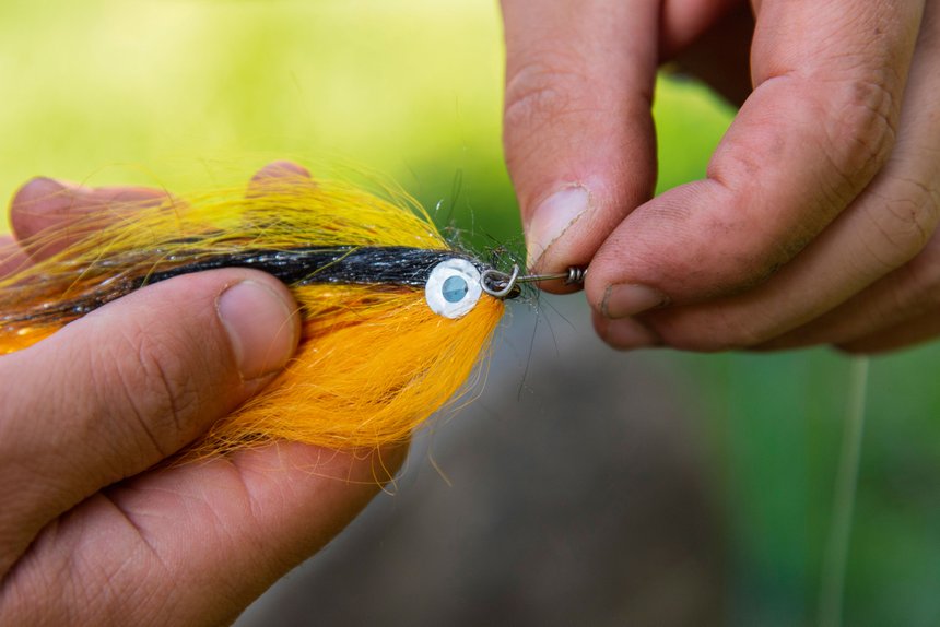 Peu de pêcheurs de carnassiers sont moucheurs et possèdent le matériel adéquat. La pêche au streamer ne leur est pas pour autant interdite et celle-ci peut très bien se pratiquer à l’aide d’une canne à leurres traditionnelle. Vous la sélectionnerez d’une puissance raisonnable, située idéalement entre 7-21 g ou 12-28 g. Cela conviendra très bien, surtout si vous prenez soin de choisir une action parabolique ainsi qu’une longueur assez importante, 2,40 m étant un bon compromis. Le streamer, par nature, n’est pas lesté, si ce n’est le poids de l’hameçon. Il suffit d’ajouter un plomb additionnel articulé, 1 ou 2 g suffisent amplement entre le leurre et l’agrafe, et le tour est joué ! Certes la descente sera moins naturelle et l’animation plus « brutale », mais vous pourrez pêcher plus rapidement et profondément.