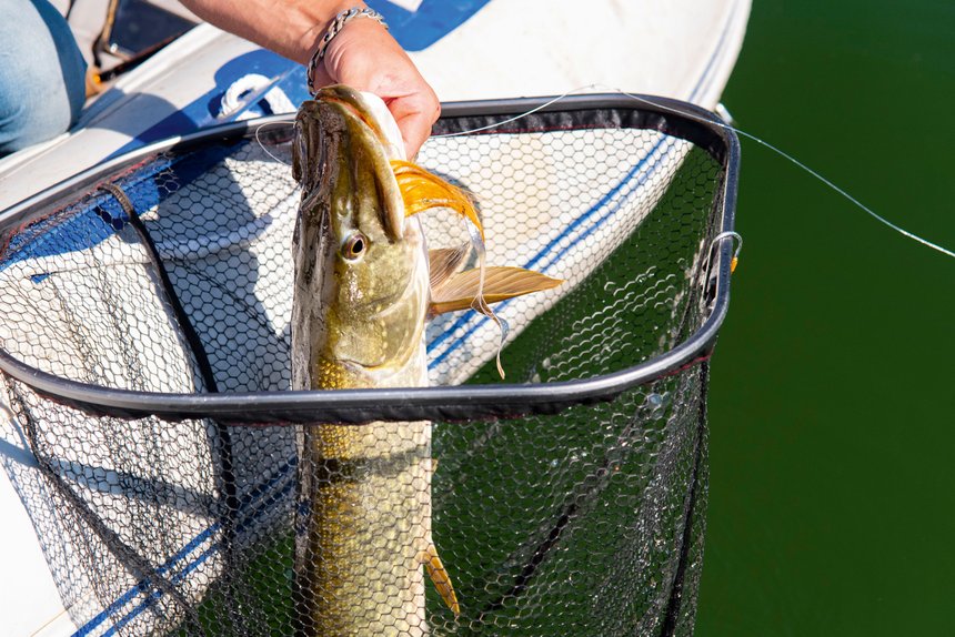 J’incite William à se rapprocher de la bordure afin de lancer son streamer au plus proche du pied des roseaux et autres branches noyées, persuadé que les poissons sont inactifs, cantonnés dans leur repaire et peu enclins à en sortir. Il s’agit donc de jouer la provocation et de modifier le statut du leurre; de proie potentielle, il doit devenir élément indésirable. Bonne pioche! Rapidement, Will réussit à faire sortir deux poissons du couvert. S’ils ne sont restés que suiveurs et non mordeurs, c’est quand même bon signe. C’est sous les vestiges d’un arbre noyé que notre moucheur va finir par en décider un : « J’ai laissé le streamer descendre le long des branches jusqu’à se poser par terre et c’est suite à la première animation que j’ai vu la soie se décaler », m’avoue Will. Le ferrage est ample et le combat commence en essayant d’éloigner le poisson de l’arbre dont le contact rugueux se ressent dans la soie. En quelques minutes, l’affaire est réglée et c’est un joli brochet d’un peu plus de 80 cm qui est amené à l’épuisette. Le temps de faire quelques photos et Will le remet rapidement à l’eau en le remerciant vivement de sa collaboration.