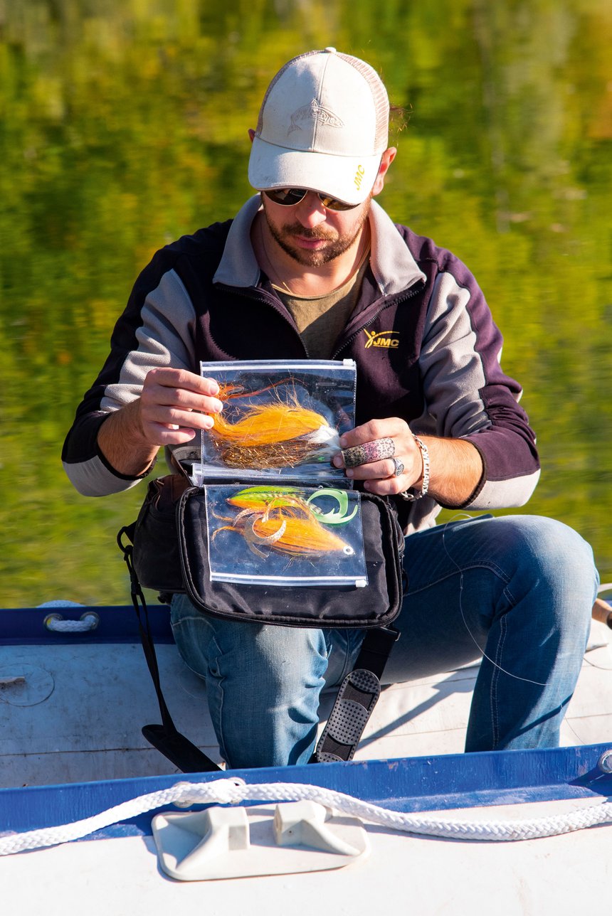 William utilise une canne Punisher VMC de neuf pieds, équipée d’un moulinet JMC Swing 79 contenant une soie intermédiaire 8/9. Le peu de matériel qu’il embarque m’intrigue ! « Je pars toujours avec un équipement restreint que je sélectionne en fonction du parcours: une pochette de différents streamers, quelques accessoires indispensables (fluoro, pinces, agrafes), une canne et un moulinet… et c’est tout ! » me confie Will. J’ai personnellement tendance à charger mon float tube de toutes les options envisageables que j’alterne rapidement en début de pêche pour voir ce qui fonctionne. William part du principe inverse: il a choisi un streamer qui lui semble idéal pour le lieu, tant en taille qu’en coloris, et va l’exploiter au maximum. Il ne changera de version que si l’absence de réaction des poissons l’y oblige et, avant de s’y résoudre, il compte bien faire le tour du plan d’eau. Il opte pour l’une de ses magnifiques réalisations, assez volumineuse pour séduire un poisson correct et largement colorée pour trancher efficacement avec l’eau fortement chargée en plancton. Il faut admettre que, pour un amateur des coloris naturels comme moi, le contraste généré par l’orange du streamer donne l’impression de balader un gyrophare sous la surface.