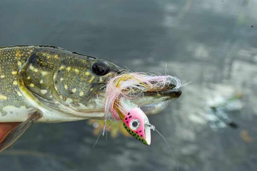 Pour réussir, comme à chaque nouvelle saison, notre approche doit fait preuve d’un peu d’imagination et de sens de l’adaptation. C’est alors que la pêche à la mouche prend tout son sens. Fini les soies plongeantes, les pêches avec des streamers XL parfois lourds. La grosse artillerie rangée, l’heure est venue de sortir des soies flottantes et intermédiaires, de descendre d’un numéro ou deux (soie de 8 ou 9) et d’opter pour un choix d’imitation « collection été » d’autant que notre cher Esox a les yeux rivés vers la surface, l’humeur badine et plus opportuniste que jamais. Avec la fin du printemps et le début de l’automne, j’avoue que c’est une de mes périodes préférées. J’opère en wading, en float-tube ou en kayak, en mode minimaliste en n’emportant le plus souvent qu’une canne, deux bobines de soie – flottante et intermédiaire –, Nylon et shock leader de rechange, une pince ainsi qu’une trousse pour ranger une dizaine de modèles de stream de surface ou sub-surface. L’observation et la compréhension du milieu dans lequel j’opère priment. La vie bat son plein : batraciens, couvées de canetons ou de grèbes, rongeurs aquatiques, banc d’ablettes, écrevisses… Le menu est pour le moins diversifié. Les oiseaux chantent, les poissons gobent, tandis que la végétation rivulaire, largement développée, assure le gîte et le couvert. Tout se passe dans la couche d’eau supérieure, et l’activité sur les hauts-fonds atteint son point culminant.