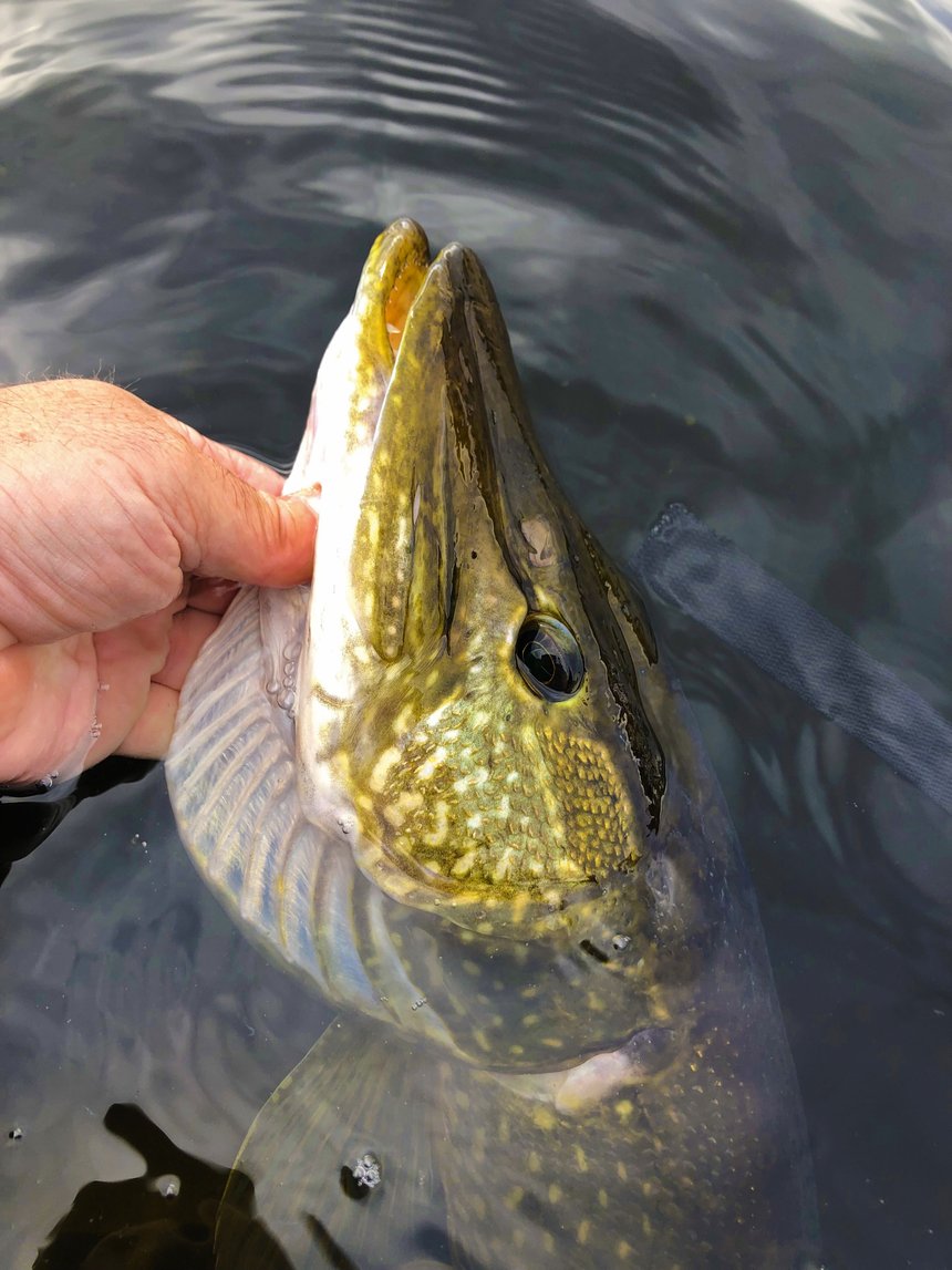 Les voyages sont toujours riches en enseignements. Je dois reconnaître que nos premières sorties sur des lacs pourtant identifiés, au point GPS près, comme abritant une riche population de brochets – un ami guide avait endossé le rôle d’éclaireur l’année précédente – furent quelque peu décevantes. Notre première erreur fut sans doute de les aborder trop tard en journée, privilégiant la lumière du soir (bien qu’il fasse jour toute la nuit !) et quelques degrés de moins… Avec cette chaleur inhabituelle des premiers jours, mieux valait taquiner les ombres dans les courants, pensait-on. Si la pêche se soldait difficilement par une trentaine de brochets à deux cannes en 4 heures de sortie, leur taille n’avait rien de folichon non plus : le plus gros atteignait tout juste 80 cm, 70 cm étant le gabarit standard. Pas besoin de plus de deux sessions pour comprendre que nous n’étions pas dans le vrai.