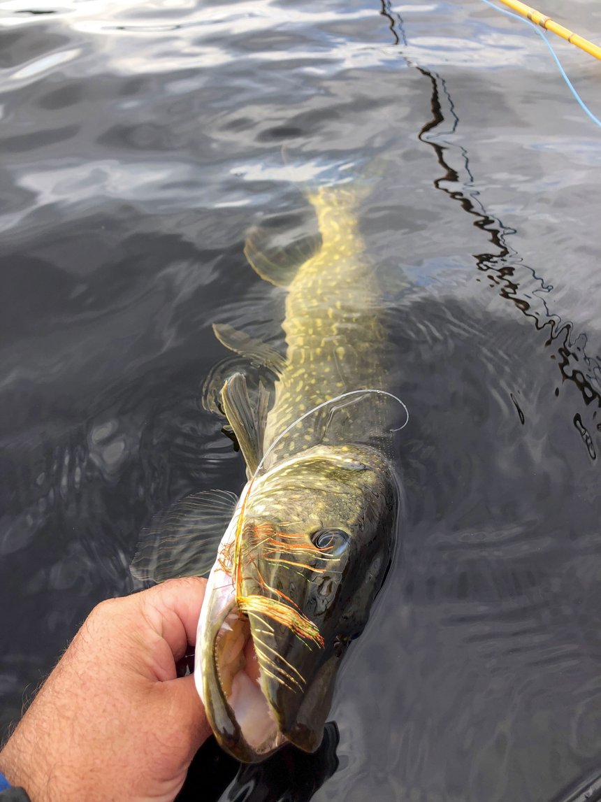 À la pêche comme dans la vie, il ne faut pas confondre vitesse et précipitation. Chercher au petit bonheur la chance de plus gros spécimens à travers une telle superficie, sans écho sondeur ni relevés bathimétiques revenait ni plus ni moins à chercher une aiguille dans une botte de foin. Il nous fallait revenir aux fondamentaux. 45 minutes de marche avec les float-tube sur le dos, en contournant tourbières et accidents de terrain n’est pas chose aisée, croiser des hordes de moustiques déchaînés non plus… Ce fut le prix à payer pour atteindre ce nouveau secteur du lac : une vaste baie peu profonde (tout au plus 2 mètres) sertie dans un paysage assez monotone. Seules quelques hauts-fonds laissaient apparaître des zones de végétation éparses. Dubitatifs nous commençâmes la prospection en remontant la rive gauche pour les uns, les autres s’engageant au plus profond de la baie. Nous fûmes assez vite fixés sur nos choix respectifs : tous les deux ou trois lancers se soldèrent par une attaque prompte à vous arracher la soie des mains… et autant de décrochés. La vélocité de ces brochets nordiques, tout comme leur pugnacité, n’avaient déjà pas manqué de nous surprendre les jours précédents. Leur intensité redoublait. Mais de là à ne capturer qu’un poisson sur trois – malgré un ferrage appuyé, canne basse doublée d’une traction sur la soie – fit monter d’un cran la pression. Nos streamers chartreuse, blanc ou à dominante orangé – le coloris semblait peu importer à vrai dire à condition de passer au bon niveau- étaient pourtant montés sur des hameçons 6/0 voire 8/0. Difficile de trouver le bon compromis car, déjà lourdes, nos imitations s’accrochaient sur un fond tapissé d’herbiers. Même dans peu d’eau, sur des bordures recouvertes de végétation, des modèles flottants ne déclenchaient que très rarement une réaction d’agressivité. Dommage et frustrant car rien de telle qu’une attaque de surface toujours spectaculaire. Après deux bonnes heures de pêche, un relevé des compteurs s’imposait en même temps qu’une pause roborative. Nous avions tous déclenché au bas mot une trentaine d’attaques, les plus adroits ou chanceux totalisaient une dizaine de brochets pris et relâchés. Pas de quoi fanfaronner, même si cette zone nous semblait déjà plus prometteuse que celle des deux jours précédents, avec une taille moyenne entre 75 et 80 cm.