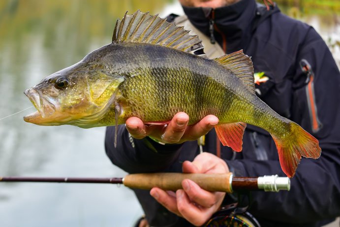 La saison froide, un carnassier réagit fort bien à la mouche : la perche. Et comme la chance est avec nous, ce sont souvent les plus grosses qui adorent nos streamers, sans doute parce qu’elles sont peu sollicitées de cette manière. Je connais quelques secteurs en rivière de seconde catégorie qui recèlent de beaux spécimens. C’est encore mieux si l’eau est haute car les perches qui suivent le fretin à la trace ne se tiennent pas loin des berges. Les meilleurs secteurs sont ceux où la rivière forme une grande lône où gardons, rotengles et ablettes se rassemblent en bancs compacts. Si plusieurs arbres morts sont tombés dans la rivière, vous aurez là un super poste à perches mais aussi à brochets.