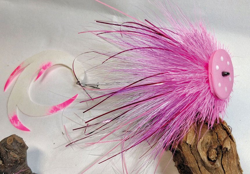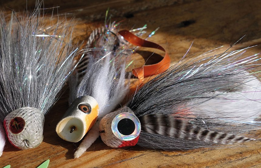 En l’absence de bavette, l’augmentation de la taille et de la superficie de la tête du streamer est un élément de départ important. Ainsi, moins profilé et plus résistant à la récupération, le streamer aura la capacité de déplacer un volume d’eau un peu plus important. De nombreux moyens sont à la disposition du monteur pour y parvenir de façon simple. Le premier est de modéliser une tête large, plate et ronde, après le travail des fibres, à l’image du mythique Buford ou d’un façonnage à partir de bucktail. Une autre option consiste à créer la tête en utilisant une large gaine tressée ce qui donne un rendu pour le moins original. Plusieurs matériaux prêts à monter, dont toute l’action est basée sur le brassage de l’eau – pike tail, dragon tail, wiggle tail, palette, etc. – sont utilisables ici.