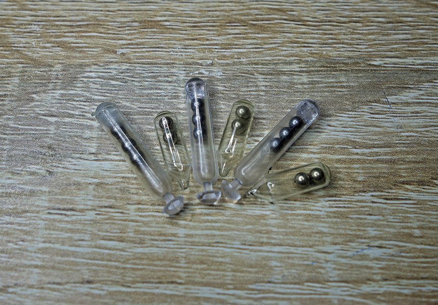 Mais on le sait, l’attractivité de certains leurres, dans des conditions de visibilité faible, vient des bruits qu’ils émettent, en général d’assez haute fréquence. La solution, ce sont bien sûr les rattles. Ces discrètes petites capsules de verre ou de plastique contenant plusieurs billes, en général métalliques, peuvent en effet « sonoriser » efficacement un streamer. Les plus petites tailles s’intègrent facilement au montage, sans impacter ni l’équilibre, ni le poids, ni la nage du streamer. Le choix du rattle devra être adapté en fonction de la taille du streamer, mais aussi du son qu’il émet. En temps normal, je pars du principe que les ondes à haute fréquence déclenchent le plus souvent des attaques par agressivité. Par eaux sales, il facilite simplement la localisation d’un streamer par ailleurs discret. Certains distributeurs proposent des modèles de rattle en plastique dont la forme est pensée pour faciliter leur fixation sur la hampe de l’hameçon. Les modèles en verre, avec leur forme très particulière, sont à intégrer différemment sachant que leur fragilité n’aide pas vraiment… Mieux vaut donc les protéger en les insérant dans une gaine. Personnellement, j’opte pour des tronçons de mylar que je ligature de part et d’autre.