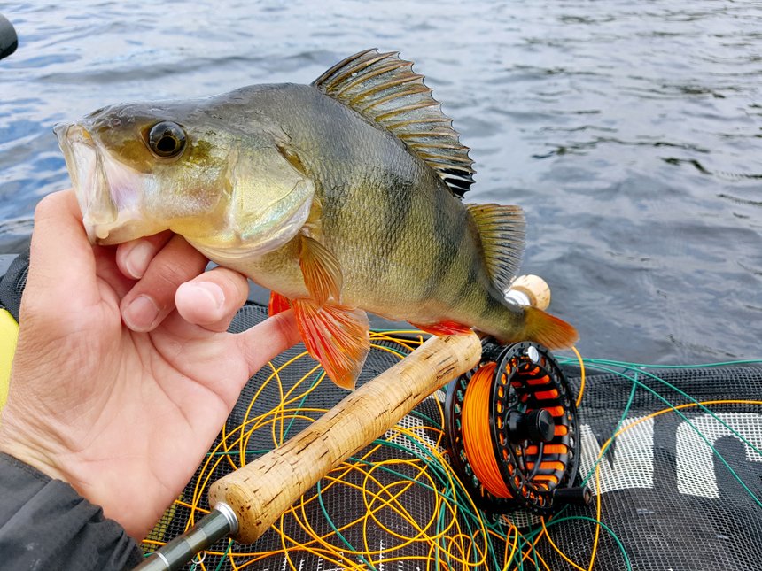 Certains jours, la pêche profonde prend le relais, sans pour autant envisager de balader un streamer dans quinze mètres d’eau, les soies plongeantes ouvrent de belles opportunités pour prolonger le plaisir. Les modèles de soie type S5 et S7 permettent de pêcher correctement dans la colonne puis de descendre jusqu’à près de 6 à 8 mètres. Place aux animations lentes et aux modèles planants animés par petits strips au-dessus du fond. Privilégier les structures, hauts fonds, les herbiers profonds. Comme pour la pêche aux leurres, l’utilisation d’un sondeur peut faciliter la localisation des perches. Durant ces périodes, les bancs sont plus sédentaires et occupent des postes récurrents. Les couleurs fluo, reflétant la lumière UV, sont des valeurs sûres pour prospecter les couches inférieures. La taille du streamer est à revoir à la hausse avec des modèles de 10 centimètres. L’intégration d’un petit rattle en verre stimulera les carnassiers en produisant des ondes à hautes fréquences. Ce petit détail peut faire de grandes différences, surtout dans les eaux sombres et mâchées des rivières en période de crue.