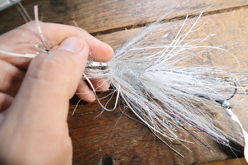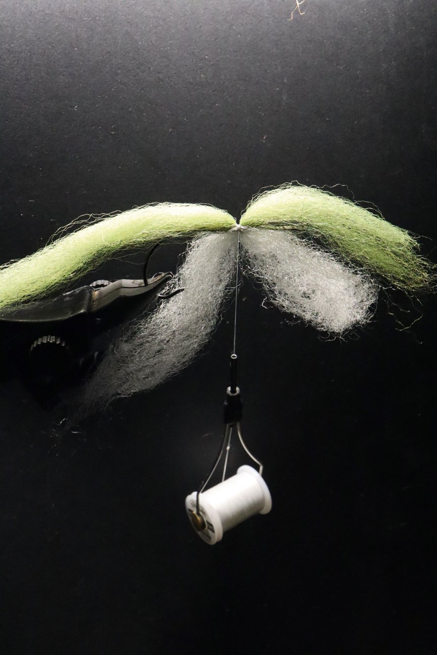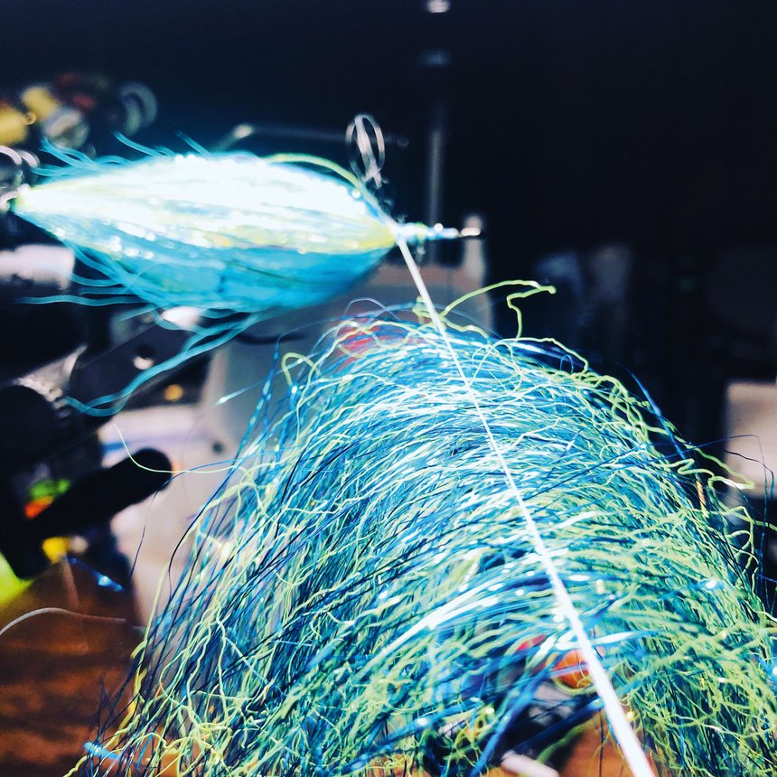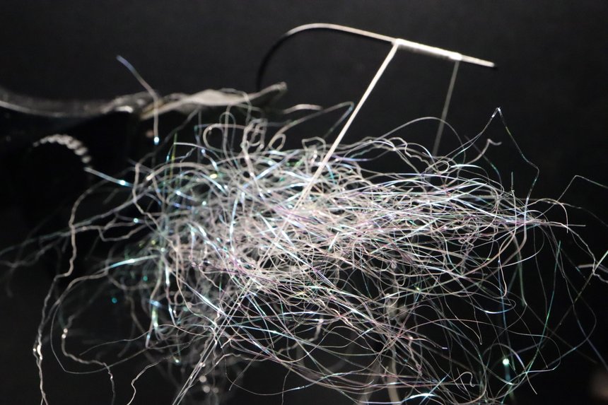 Dans la classe des fibres synthétiques qui nous viennent tout droit de l’univers textile nous trouverons enfin : les fibres polymères. De différentes natures, elles sont un parfait complément aux autres fibres évoquées jusqu’alors car un nouveau paramètre rentre en jeu: le volume. Ghost fibre, EP Fiber, Demone Air, fibres SWS et j’en passe toutes les marques vous en proposent. Ce sont des matériaux idéaux pour le montage de « minnows » et autres formes de poissons (baitfish). Mais aussi précieuses pour la confection d’une « âme » de streamer un peu long, solide mais surtout avec du « corps » qui poussera beaucoup d’eau. J’entends régulièrement autour de moi qu’il est difficile d’utiliser des fibres car le rendu final nécessite souvent une taille peu naturelle avec des finitions « coupées au couteau ». Le secret pour monter un joli baitfish en fibre est justement de faire une préparation en amont du montage en prédécoupant les longueurs pour ensuite les assembler sur l’hameçon par un jeu de pliage. Travailler la coupe des fibres en amont donne un rendu plus naturel.