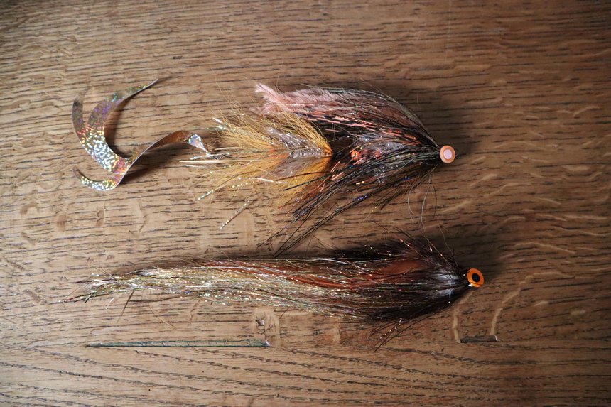 Il n’est pas nécessairement utile d’utiliser de la grosse chenille dans vos montages, au contraire, elle ne sert qu’à habiller la hampe entre les deux parties principales du streamer. Trop le surcharger le rendrait plus difficile à lancer. Ici on voit bien que par rapport à la taille du leurre la chenille représente une partie non négligeable mais est de taille modeste. Les brushs quant à eux, un peu plus long, peuvent faire partie intégrante du corps du streamer ou bien servir collerette de « finition » en tête. Un des types de fibre le plus utilisé dans le montage va être ce que j’appelle les fibres de type « tinsel » vulgairement appelé « flashabou ». Il s’agit ni plus ni moins de fibres brillantes, holographiques ou non, elles peuvent être de différentes largeurs. Nous trouverons principalement deux tailles dans le commerce, les fibres de 1/69’’, les plus fines comme le flashabou « classique », et les 1/32’’ que l’on retrouvera régulièrement sous l’appellation « magnum ». Ces fibres sont très intéressantes pour habiller votre streamer et lui apporter une robe avec plus ou moins d’éclat. Relativement souples il sera difficile de s’en servir pour donner du corps à votre mouche, sauf pour les montages de types sparkler composées essentiellement de ces fibres qui auront pour principal attrait leurs reflets plutôt que leur volume. À mon sens, la taille magnum reste la plus intéressante pour les montages brochet, la largeur supérieure de la fibre lui confère une plus grande résistance que sa petite sœur face aux dents des poissons. Surtout lorsque nous avons besoin de garder une certaine longueur (plus de 10 cm de fibre).