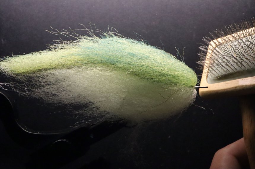 Je vais commencer par opposer deux types de fibres et matériaux synthétiques. Nous avons les chenilles et les brushs d’un côté, et les fibres non liées de l’autre. La distinction est relativement évidente une chenille ou un brush est un assemblage de fibres emprisonnées au sein d’une âme. Pour la chenille cette âme sera généralement de nature textile alors que le brush est souvent fabriqué à partir de fil métallique comme un cuivre fin par exemple. Ce type de matériaux viendra systématiquement s’enrouler autour d’un hameçon, d’un tube ou d’un shank. Ces matériaux sont très utiles dans la réalisation de streamers de grande taille, notamment lorsque les hameçons utilisés ont une hampe longue. En effet, ils permettent d’habiller ladite hampe sans trop alourdir le montage.