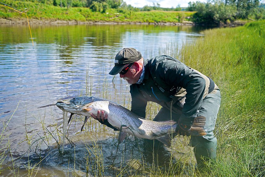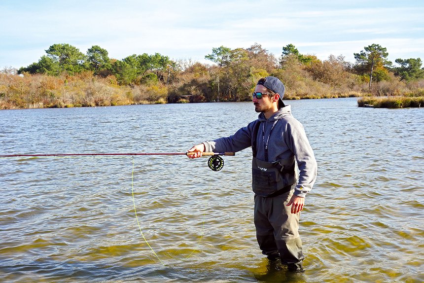 Au-delà de l’aspect dégagé d’une berge, il est important pour gagner en aisance de pouvoir se déplacer et d’avancer sur cette frange littorale. La pêche à la mouche s’adapte ainsi très mal aux secteurs abrupts et encaissés. Comme pour la pêche de la truite, lorsque l’encombrement d’une bordure est trop handicapant, pratiquer en wading permet de contourner cette difficulté. Les waders font donc partie de l’équipement indispensable qui, en plus d’apporter tout le confort nécessaire, permet en outre d’adapter ses angles d’attaque. Lorsque l’espace vient à manquer, les distances de posé atteintes ne permettent pas toujours de longues immersions du streamer. C’est un point limitant dans une pêche qui repose essentiellement sur la stimulation des carnassiers par la vue. Un streamer doit rester un minimum de temps dans l’eau pour être détecté, visualisé puis attaqué. C’est donc dans le but d’améliorer à tout prix ses distances de lancer que doit être conduit le choix de chacun des éléments de son équipement.