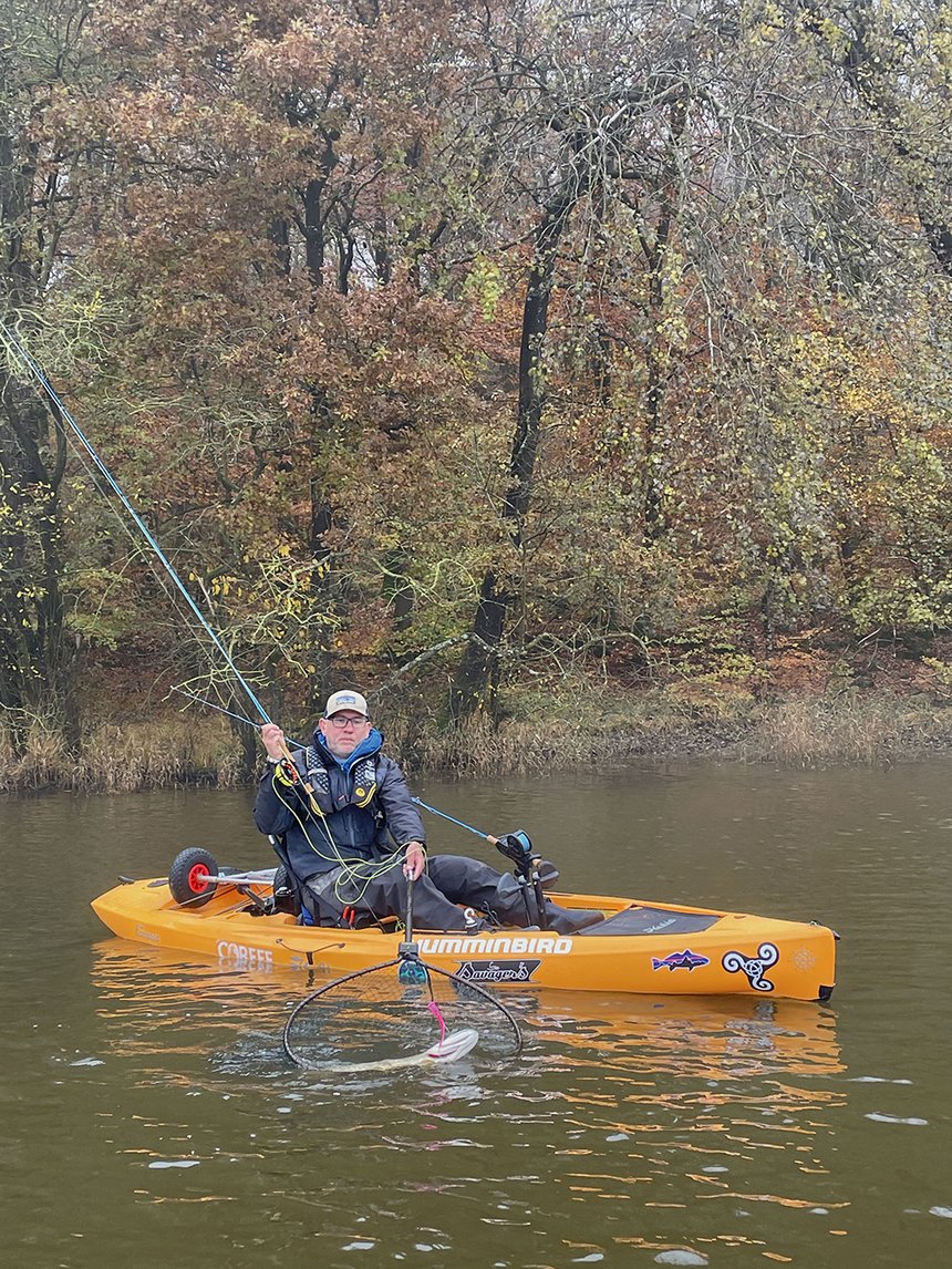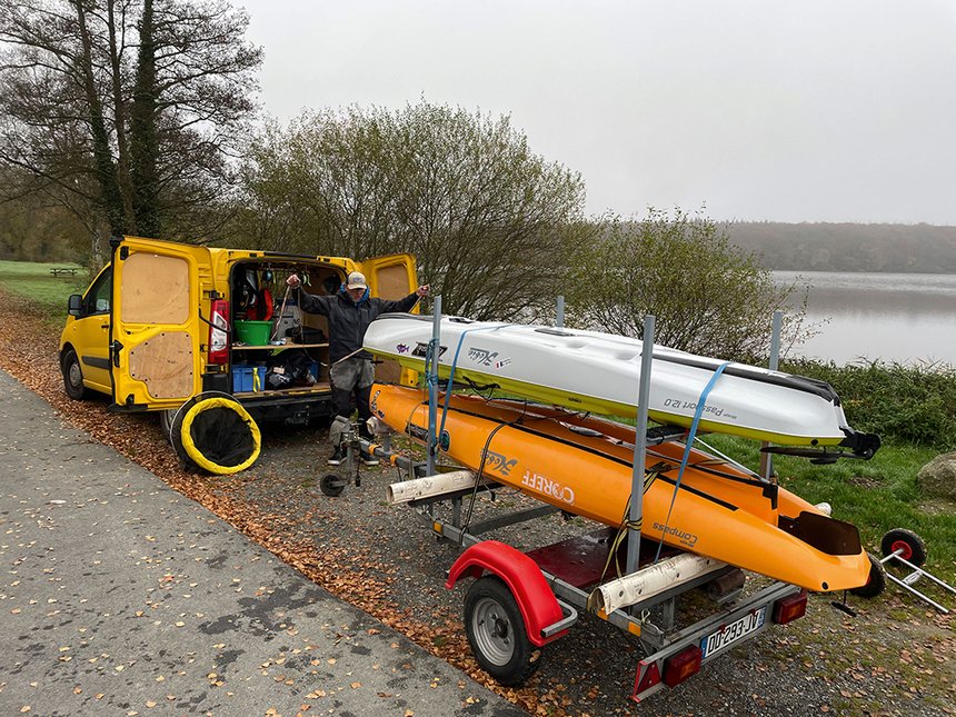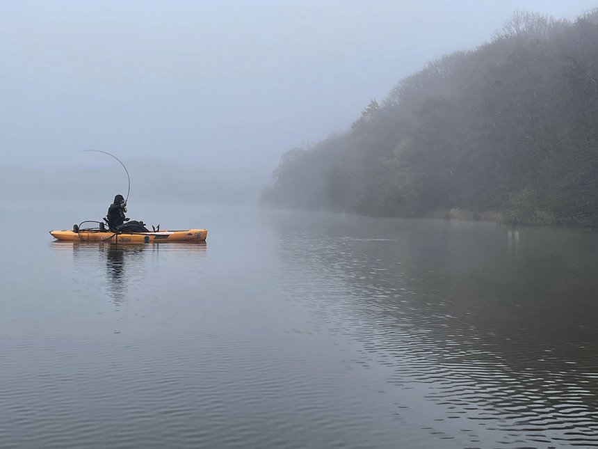 « Pop in the fog » ! Non ce n’est pas le titre d’un polar, plutôt l’histoire d’une sortie récente au brochet avec mon ami Éric, qui est parmi les guides de pêche les plus rock’n’roll que je connaisse. Laissez-moi vous la raconter. « Heureux sont les fêlés car ils laisseront passer la lumière… » La lumière, nous en avons bien besoin ce matin-là. Nous avons rendez-vous au bord d’un lac breton pour une sortie « brochet à la mouche en kayak ». Ce projet longuement mûri et tant attendu est quelque peu contrarié. Un brouillard à couper au couteau ne nous laisse pas entrevoir la plage de mise à l’eau où nous avons nos habitudes. La météo avait bien annoncé une baisse des températures – quoi de plus normal en cette fin d’année ? – mais pas cette humidité qui ne tarde pas à nous tomber dessus. Température extérieure : 4 °C, celle de l’eau ne dépasse pas les 6 °C. Va falloir mettre des couches même si le kayak à pales, c’est plutôt sympa pour se réchauffer ! « Bon, on y va où on attend que ça se lève ? » « Ben j’ai l’impression qu’on va attendre longtemps », me rétorque Éric, qui est déjà en train d’endosser ses waders.