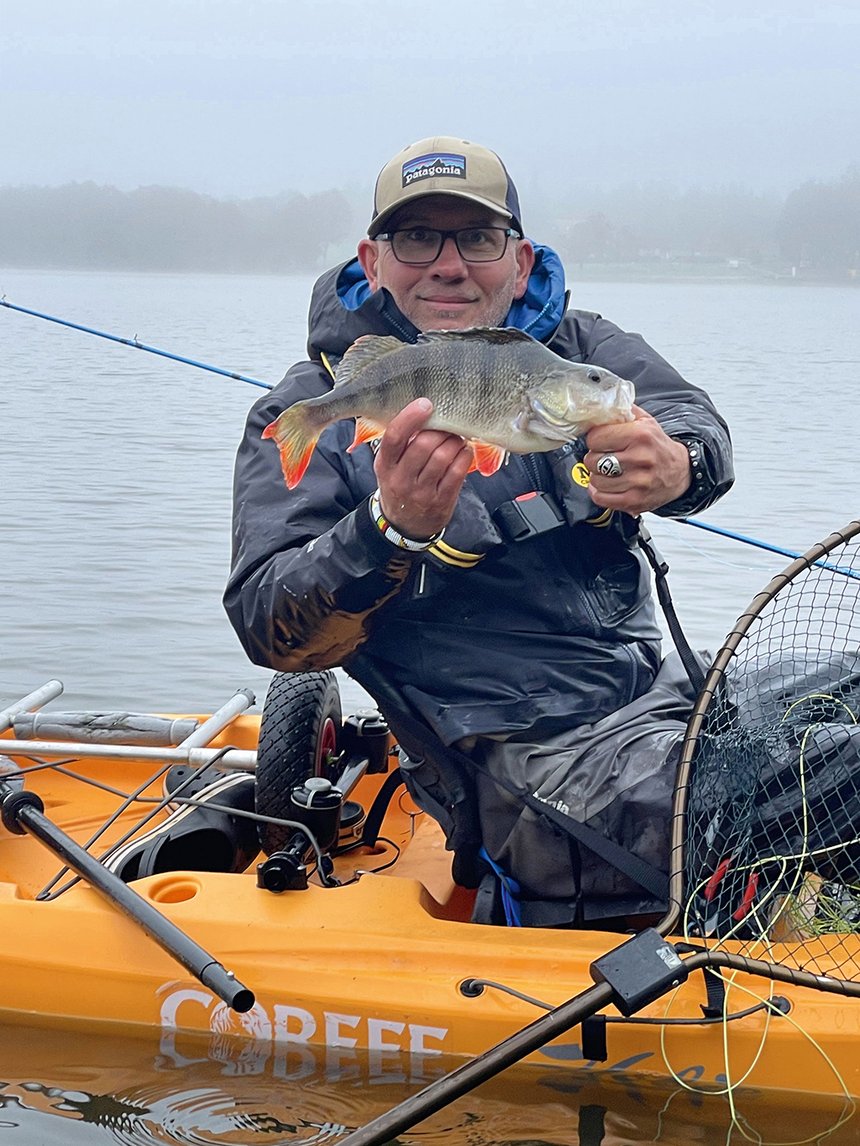 Coutumier de ces épisodes hivernaux où le brochet se montre actif dans la couche d’eau supérieure, une chose m’étonne néanmoins : la quasi-absence d’animation. L’impact du popper sur l’eau, une légère tirée, c’est à la reprise d’un stop prolongé que nous enregistrons la plupart des attaques, voire à l’arrêt total. En début d’après-midi, une légère brise de nord-ouest ride la surface de l’eau. Vent dans le dos, je stabilise la dérive de mon kayak grâce à sa marche arrière et son gouvernail, une bête de pêche soit-dit en passant, qui m’autorise de belles dérives maîtrisées. Curieusement, l’activité des carnassiers semble avoir baissé alors que le brouillard matinal s’est un peu dissipé. L’air ambiant a pris 2 °C. On s’attendrait presque à voir le soleil percer. Éric fait une belle perche qui frôle les 40 cm. Puis plus rien pendant une heure. Le doute s’empare de nous d’autant qu’une chasse, non loin de la bordure, trahit bien la présence de notre prédateur. Un paramètre semble avoir changé ! Il nous échappe, s’attachant à répéter l’animation qui a si bien fonctionné le matin. Je change de modèle de coloris, de taille, rien n’y fait. La patience légendaire de mon ami Éric semble avoir atteint ses limites. Je l’entends bouillonner sur son kayak. Montée en pression, l’explosion n’est pas loin !