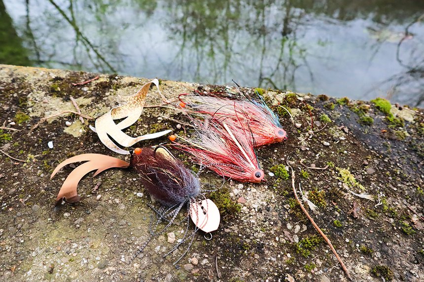En ce qui concerne le type de soies à privilégier, il est difficile de se positionner sur un choix unique. Dans la majorité des cas, je préfère pour les pêches de poste une soie flottante avec un profil court, chargée sur l’avant avec un talon de bas de ligne puissant pour déposer précisément mon streamer. Ce dernier, quant à lui, est dans la majorité des cas lesté en tête pour descendre le long des obstacles. Ce lest peut être directement ajouté au montage de votre mouche, par un casque en tête ou quelques tours de plomb sur la hampe de votre hameçon. Cette façon de lester vos streamers type baitfish ou flash tail est très intéressante, notamment pour chercher une action plutôt planante qui aurait tendance à couler comme une feuille morte lors de l’arrêt de l’animation. Ainsi, avec de longues pauses, vous imiterez une proie facile, comme un poisson blessé.
