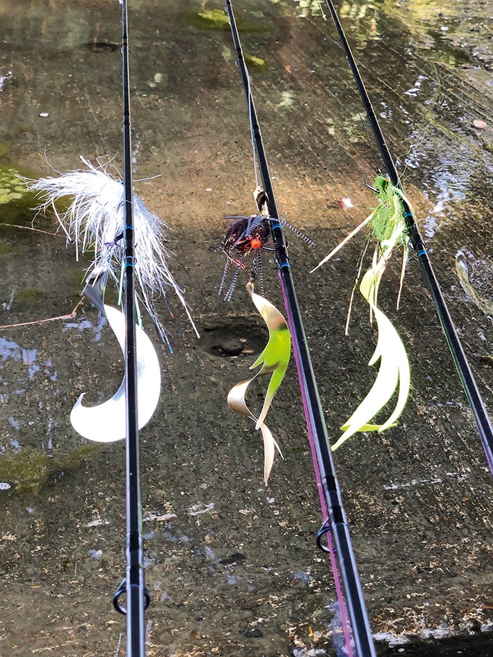 Si vous rencontrez un poisson suiveur sur plusieurs mètres, arrêtez tout ! Faites une grande pause de quinze à trente secondes, quitte à laisser le streamer couler sur le fond, puis réalisez un redémarrage sec avec une grande tirée. Cela déclenchera à coup sûr une attaque ! En revanche, si un poisson vous suit plusieurs fois, c’est que vous n’allez pas assez vite. Accélérez drastiquement la cadence, par un passage en « rolly poly » par exemple. En d’autres termes, ne le laissez pas réfléchir ! Les bordures ensoleillées abritées du vent sont des postes de choix en début de saison. En effet, l’eau aura tendance à se réchauffer légèrement plus vite que le reste de la surface, ce qui est un poste de choix pour le poisson ! Une autre arme « démoniaque » pour le début de saison : les streamers à palette de type « chatter-fly ». Ce streamer, lesté en tête par la palette, permet une pêche de poste efficace. Privilégiez des lancers courts et tendus (c’est très important). Laissez votre streamer atteindre le fond, puis réalisez quelques tirées sèches pour le faire remonter et, enfin, actionnez la palette. Cela déclenchera sans aucun doute un poisson, qu’il soit embusqué près d’un obstacle ou en attente sur un herbier. Notez que l’utilisation d’un bas de ligne en gros fluorocarbone en 90 ou 100 centièmes rigide est à privilégier par rapport à un fil acier qui aura tendance à s’emmêler dans la palette et à fragiliser le bas de ligne.