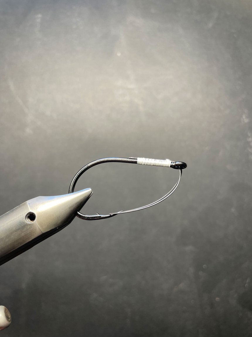 La deuxième solution est un système en titane plié qui viendra en butée contre la pointe de l’hameçon. Ce dispositif est un peu plus délicat à mettre en œuvre mais fait merveille. Le côté raide du fil de titane va permettre un déclenchement rapide de la pointe au moindre ferrage et évitera pas mal de ratés. Ce système a fait ces preuves sur des pêches de tarpon en plein milieu des nuages de sargasses, c’est donc sans hésiter que je l’ai décliné sur des montages de type baitfish ainsi que sur tous les montages qui nécessitent l’utilisation d’hameçons courts avec une grande ouverture. Pour tous les montages plus longs, l’hameçon texan, monté de manière articulée ou non, sera plus efficace dans les milieux les plus encombrés ou les plus denses. Avec une pointe « noyée » dans une fibre raide comme du bucktail, votre mouche passera partout sans accrocs !
