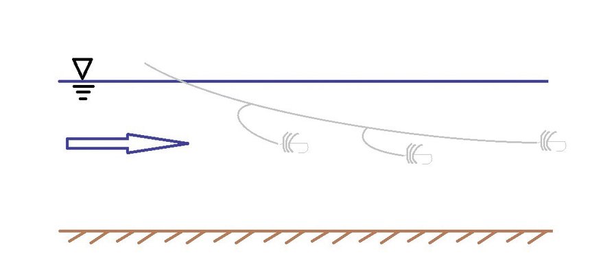 • Une prospection de surface : c’est une application à la pêche en noyée avale. Plus il y aura de surface à couvrir, plus on mettra de potences (dans la limite de trois mouches en France), et plus on les écartera. Dans le cas des postes plus marqués ou des petites rivières, deux noyées peuvent suffire. On espacera généralement les mouches de 80 cm sur les postes marqués à 120 cm, s’il faut couvrir rapidement de grandes étendues d’eau.