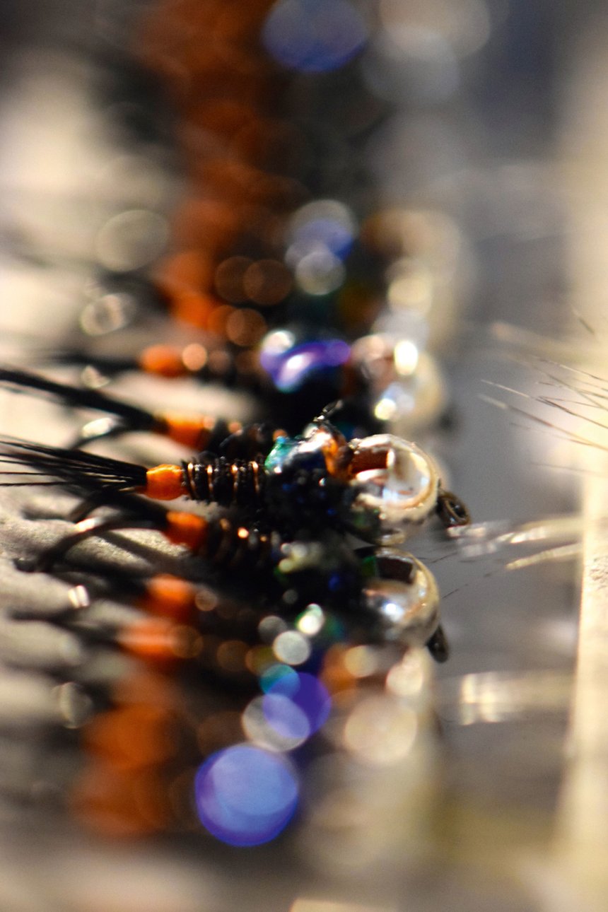 Par rapport aux eaux claires, pêcher des eaux teintées demande quelques ajustements. En début d’épisode pluvieux, les pêches en sèche peuvent rester prolifiques et nous devons nous adapter pour garder notre mouche en visuel sur une surface qui se teinte progressivement. Afin d’augmenter la visibilité, j’aime utiliser des mouches foncées (ou comportant un repère fluo) qui pourront, par exemple, se substituer aux modèles plus clairs. Des artificielles claires avec des toupets fluo pour la vue du pêcheur et des tags sombres pour celle du poisson peuvent également être efficaces. Pour les nymphes, le concept est très similaire. Une imitation avec une bille noire en tête ressortira toujours mieux qu’une autre dans une eau chargée en matières. Nous pouvons également jouer sur les teintes d’autres parties du corps de nos nymphes. Même accompagnés d’une bille d’un coloris « classique », un abdomen et un thorax foncés ou noirs restent très visibles dans ce genre d’élément. Choisir d’utiliser un dubbing brillant pour le thorax voire un tinsel fin pour le cerclage peut favoriser le renvoi des quelques rayons de soleil perçant la couche d’eau et attirer ainsi l’œil des truites en maraude.