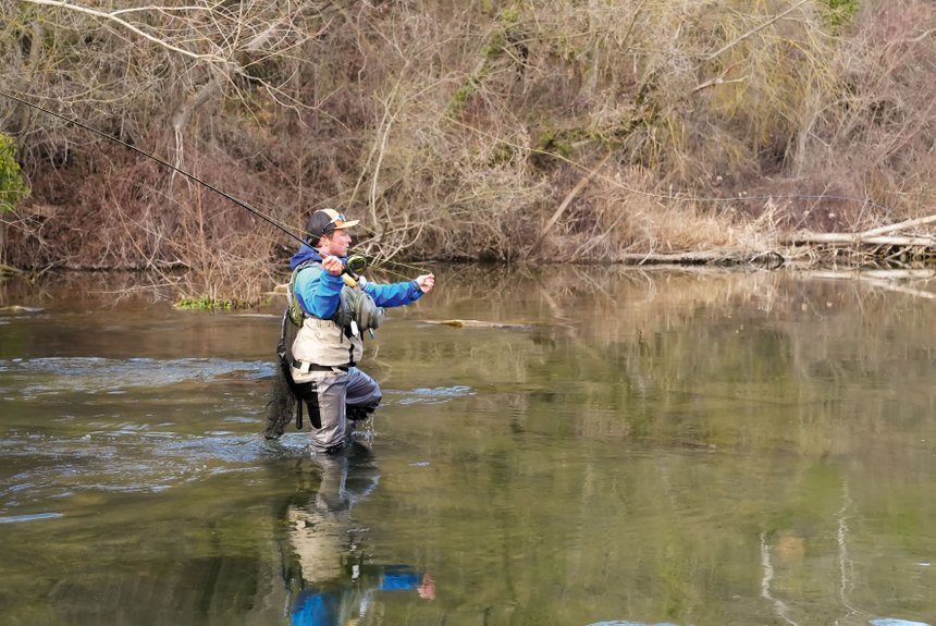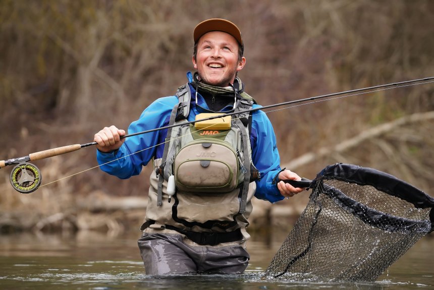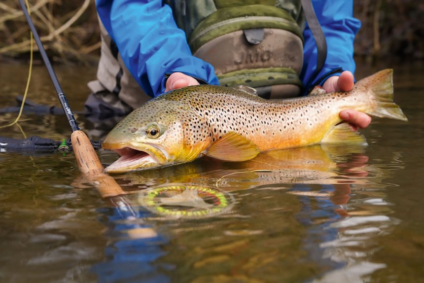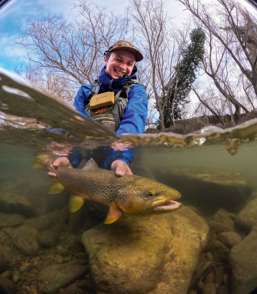 Au réveil dans le van après une nuit relativement glaciale et après un bon thé bouillant, le mauvais karma continu : la rivière est d’une couleur grise avec un fort débit. Damien n’en revient pas, il n’a jamais vu cela ici, même avec les pluies, l’eau reste claire d’habitude ! Durant un long moment, nous nous sommes demandé qui était le chat noir entre nous deux. Nous en rions, mais nous sommes déçus. Nous reprenons la route pour trouver un spot où l’eau ne sera pas trop sale. Nous décidons de changer de rivière et de faire un long trajet en van de bon matin ; la journée s’annonce compliquée. De l’eau claire à notre arrivée ! Le moral remonte rapidement et, les waders vite enfilés, nous sommes dans l’eau, les yeux rivés sur la surface, mais rien. La lumière est aussi absente, le ciel est couvert, l’espoir serait qu’un rayon de soleil décide les truites à sortir au bénéfice d’une petite éclosion. Le froid est toujours bien présent, la petite brise gèle les mains et l’eau est glaciale. Nous remontons donc la rivière à pied durant de longues heures à la recherche de gobages, mais toujours aucun signe de vie. Vers 16h30 après une bonne séance « d’aquagym » dans l’eau glaciale, quelques nuages commencent à se disperser et laissent place à une lumière plus intense, puis aux rayons de soleil qui nous réchauffent. Cette éclaircie tant espérée arrive tard dans la journée, mais l’espoir refait surface, quelques oiseaux volent au-dessus de nous, des hirondelles et des bergeronnettes s’agitent. Les premiers moucherons font leur apparition, nous continuons notre prospection avec plus d’entrain. Nous arrivons sur un lisse et attendons un moment en espérant observer une truite active en surface. Devant nous en fin de courant, à quelques mètres de l’accélération, un rond très discret dans l’eau ondule à la surface, suivi d’une petite bulle et, une seconde après, d’un bout de queue de poisson qui fend la surface de l’eau. Il n’y a plus de doute, c’est un très joli poisson qui a l’air de prendre des émergentes.