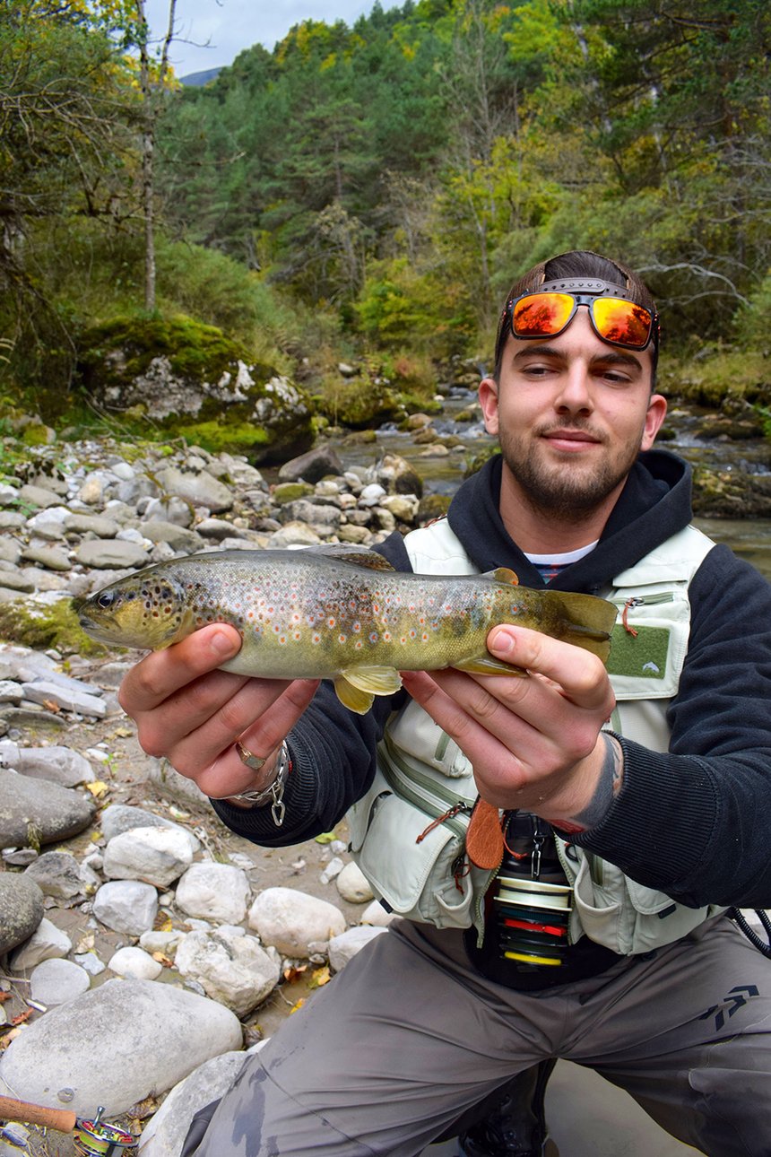 Dans ces biotopes, les périodes pour espérer prendre régulièrement des salmonidés en sèche peuvent varier du tout au tout d’une année à l’autre. Les expériences de terrain me permettent d’affirmer qu’à l’arrivée de l’été les truites sont enfin enclines à lever le museau pour intercepter des insectes dérivant en surface. On peut donc dans ce cas leur proposer notre Tavan et ce jusqu’à la fin du mois de septembre lors d’éclosions massives de trichoptères. Montée sur hameçon de 12, cette mouche aux tons brunâtres peut éventuellement décider nos partenaires de jeu en mars et avril lorsque les éclosions de March Brown sont bien installées et les gobages visibles. Dans ces milieux hostiles et froids une grosse partie de la saison, les poissons se nourrissent à 80 % sous la surface de l’eau. Ce qui donne du « grain à moudre » à notre nymphe toute l’année ! En jouant principalement sur les tailles et profils d’hameçons, les poids et les couleurs de billes, on aurait presque de quoi couvrir la totalité de nos besoins avec un seul modèle.