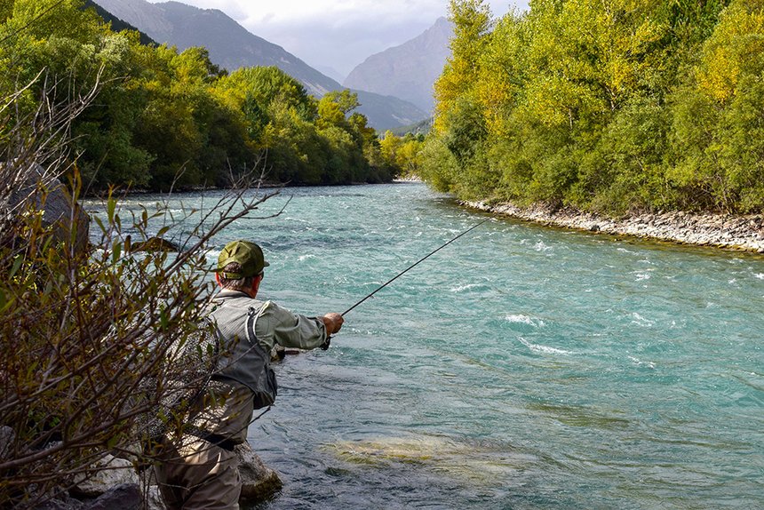 Avec ces deux artificielles, la question n’est pas sur quels postes les utiliser puisque ces derniers sont manifestement identiques. En effet, nous visons des zones semi-rapides à rapides, des postes marqués, courts ou longs, des bordures de courants plus ou moins puissants ou encore des fins de lisses peu profondes et peu agitées pour y faire dériver notre sèche. Sur ces postes potentiels, on associe le Tavan à des pêches plein amont ou 3/4 amont. Il excelle en présence d’activités de surface soutenues ou l’été pour pêcher l’eau par de faibles profondeurs. De plus, il est possible de le coupler à une nymphe en début ou en fin d’éclosion, voire simplement lorsqu’on désire pêcher les deux couches d’eau supérieures. Les tailles 14 et 16 sont de mise ici. La Pheasant tail « jig » entre en jeu seule et uniquement en pointe quand il est nécessaire de pêcher des postes courts près du fond. En longues dérives, elle peut être surmontée d’une autre artificielle qui prospectera la couche intermédiaire. Le plus important est de présenter sa nymphe aux poissons à la bonne profondeur sans draguer. L’idée est de la faire évoluer le plus longtemps possible dans l’axe du scion de la canne. De cette façon, celle-ci dérivera naturellement et suivra parfaitement la veine d’eau choisie. Mécaniquement parlant, on comprend donc que le fait de pêcher plein amont, 3/4 amont, ou plein travers importe peu du moment qu’on a une canne assez longue pour contrôler au mieux la dérive de notre ligne. Son action ne doit pas être trop rapide pour permettre une pêche « légère » avec de petits jigs si le besoin s’en fait sentir.