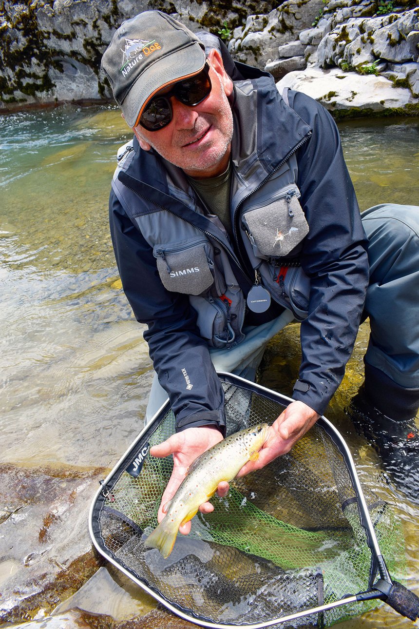 En rivière moyenne, je prends plaisir à pratiquer une pêche de truites plein amont en prospectant les fins de lisses dans un premier temps pour ensuite me rapprocher progressivement des têtes de lisses. Cette technique dévoile tout son potentiel lorsqu’il faut scruter les courants ou les éventuels postes à distance. Ces derniers pouvant se trouver à 10 mètres comme à 20 mètres de moi. Elle peut être tout à fait complémentaire avec une pêche à vue. Fervent adepte des cannes de 10 pieds, qui offrent une belle polyvalence, j’apprécie aussi l’utilisation de 9 pieds pour soie de 4 d’action plutôt rapide. Tout en gardant une certaine discrétion au posé, elles permettent des ferrages immédiats et efficaces lors des arrêts du fil indicateur, celui-ci pouvant se trouver à plusieurs mètres du pêcheur. Côté moulinet, un manuel à bobine large Arbor offre un meilleur enroulement de soie et facilite la gestuelle lors des faux lancers (aucun risque que la soie s’enroule autour de la gâchette). Le bas de ligne dégressif doit pouvoir véhiculer rapidement l’énergie jusqu’à la mouche. Voici une formule pour les rivières moyennes :