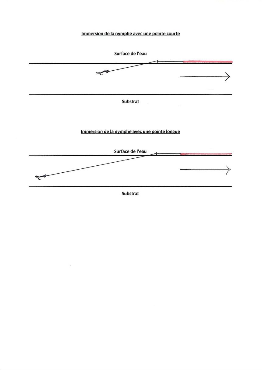 Celui qui souhaite rallonger ce bas de ligne peut aussi commencer par 85 cm de Nylon en 45 centièmes et atteindre dans ce cas une longueur de 4,70 m, pointe comprise. La longueur de pointe ne correspond pas forcément à la profondeur du poste (comme cela peut être le cas avec les autres pêches au fil). Bien que primordiaux pour une visibilité optimale des touches, les graissages réguliers du brin fluo et du porte-pointe ralentissent l’immersion de la mouche. L’utilisation de petites nymphes peu plombées nécessite donc une longueur de pointe supérieure à 1 mètre pour une descente non bridée et une évolution naturelle entre deux eaux. Une bonne qualité de Nylon en 12 centièmes reste un bon compromis qui allie solidité et plongée rapide des artificielles. Ici, inutile d’avoir recours au fluorocarbone car on ne cherche pas automatiquement à flirter avec le fond.