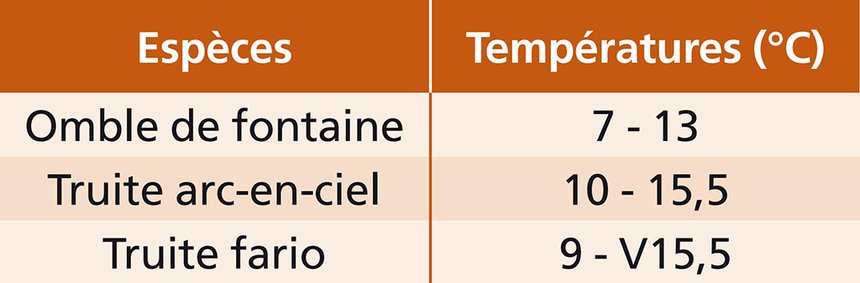 Un poisson, quelle que soit son espèce, ne peut vivre que dans un milieu qui lui est adapté selon certaines caractéristiques telles que les températures, le taux d’oxygène dissout (taux en partie lié à la température), pH, etc. Pour ce qui nous intéresse dans ces lignes, concentrons-nous sur la truite arc-en-ciel qui peuple majoritairement nos réservoirs. Comme tous les êtres vivants, et particulièrement les animaux à sang froid, les truites ont un métabolisme qui évolue selon une multitude de paramètres dans le milieu, et notamment la température et le taux de dioxygène dissous. Si on s’intéresse à la température, facteur prédominant dans l’activité alimentaire de la truite, la plage idéale de température pour favoriser son activité (et de ce fait sa croissance) se situe entre 10 °C et 15,5 °C (source : Fish hatchery management/Robert G. Piper).