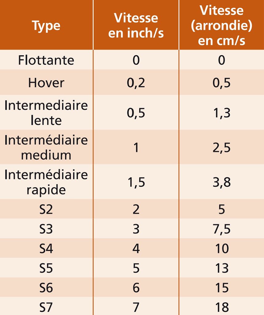 C’est LA pêche de prospection par excellence ! Elle permet de pêcher « vite », de trouver la zone d’activité principale, la profondeur de pêche, les coloris, les vitesses… Pour après s’adapter précisément. On jouera sur la densité des soies pour trouver la profondeur des poissons actifs. Rappel, la vitesse de plongée n’a rien à voir avec le poids de la soie, une WF7 pouvant être flottante ou plongeante à différentes vitesses comme le rappelle le tableau suivant :