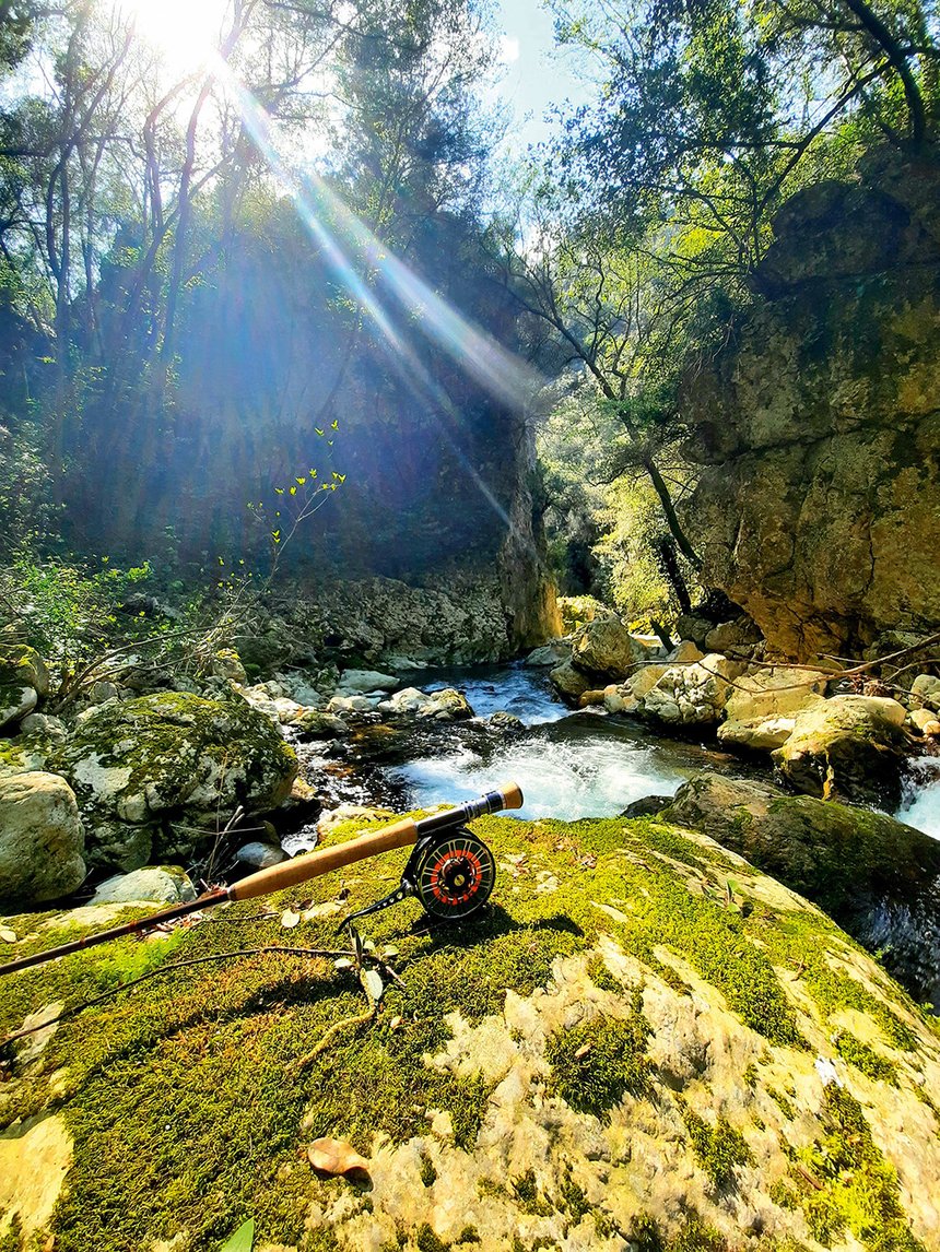 Ayant une préférence pour les cours d’eau de taille moyenne, de 10 à 20 m de large, j’en choisirai un s’écoulant entre 300 et 800 m d’altitude alternant lisses et courants. Pour optimiser mes chances de réussite que ce soit en sèche, comme en nymphe ou en noyée, question matériel, mon expérience m’amène à jouer la carte de la polyvalence et de la simplicité, afin de pouvoir pêcher sur ou sous la surface efficacement. Mon kit favori pour les rivières convoitées se compose d’une canne de 10 pieds #3/4, accompagnée d’un moulinet semi-automatique sur lequel est installée une soie WF 3. Mon bas de ligne, simple et dynamique, composé de trois brins : 1 m de 40, 0,90 m de 30 et 0,80 m de 20/100 avec micro-boucle, me permet un changement rapide de technique. À cette micro-boucle, pour pêcher en nymphe au fil sans soie, je fixe 15 m de fil bicolore (stocké sur un plioir en mousse rond) en 18/100 et pointes-en 12 ou 14/100. Pour pêcher en duo sèche/nymphe, 1,50 m de 14/100 servira à fixer les deux mouches. Pour pratiquer en noyée j’opte pour un bon mètre de 14/100 incluant une potence. En sèche une pointe en 12/100 directement montée sur la micro-boucle me permet de faire face à la plupart des situations.