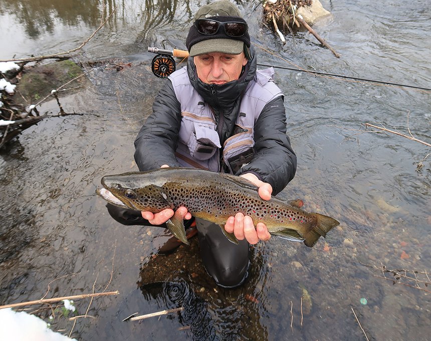 La pêche au streamer est elle aussi une technique à laquelle il faut penser en ce début de saison pour pêcher les grandes rivières. Comme je l’ai déjà écrit dans les colonnes de notre magazine, je suis un adepte de plus en plus inconditionnel des petits streamers de type « arlésienne », à aile en fibres raides coiffées de marabout olive, lestés sur le corps et en tête (yeux), dans des couleurs imitatives (gris-olive-nacré) et munis d’un petit tag incitatif (rouge, orange). Ce type de streamer me rapporte chaque année de nombreuses truites sauvages de taille très respectable ! Pour la pêche en sèche en cette période d’ouverture, les baétidés de couleur gris et olive éclosent volontiers sur les grands lisses en toute fin de matinée ou dans l’après-midi, parfois même jusqu’à 17 h, et provoquent parfois une belle activité des truites en surface. Autour de midi, les éclosions des célèbres March Brown déclenchent presque à coup sûr des gobages parfois impressionnants et c’est souvent l’occasion d’inaugurer sa saison de pêche de la plus belle manière qui soit en capturant une grosse truite. Les zones les plus favorables correspondent aux petits courants et au début des grands lisses sur des fonds de graviers et de galets. Pensez également aux plécoptères, souvent ignorés des pêcheurs et qui sont pourtant bien présents en ce début de saison. Le meilleur conseil que l’on pourrait donner pour aborder les grandes rivières en cette période d’ouverture c’est de ne pas monter son matériel à l’avance mais d’aller plutôt au bord de l’eau avant de décider d’une stratégie en fonction des circonstances et de la configuration des postes.