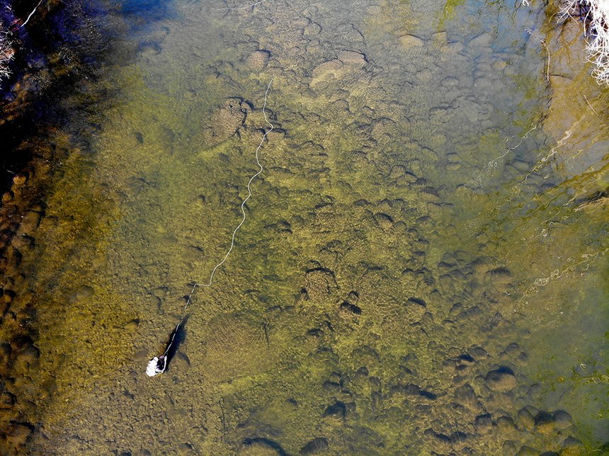 Il faut être méthodique et le découper en secteurs à prospecter. Pour ce genre de pêche, il faut soit une soie ultra fine type « compétition nymphe », « Euronymphing » qui font 0,60 à 0,55 centième mais que je n’apprécie pas plus que cela, soit pêcher à l’espagnole avec du fil de 16 à 20 centièmes et en mettre au moins une douzaine de mètres sur votre moulinet, ou encore utiliser un nouveau produit très intéressant importé par Le Moulin de Gémages, une tresse de quinze mètres faite par Terenzio, ultra-fine et possédant déjà deux micros boucles dont une colorée, orange/rose pour repérer les touches. J’avais commencé à tester le prototype la saison dernière et je vous en parlerai dans un prochain test matériel. Tout cela pour dire que vous allez devoir pêcher d’abord sous la canne, puis allonger les lancers pour peigner efficacement les différentes veines d’eau. Une soie classique ne vous permettra donc pas de le faire correctement à distance, le poids de la ligne tirera trop sur votre bas de ligne et altérera vos dérives.