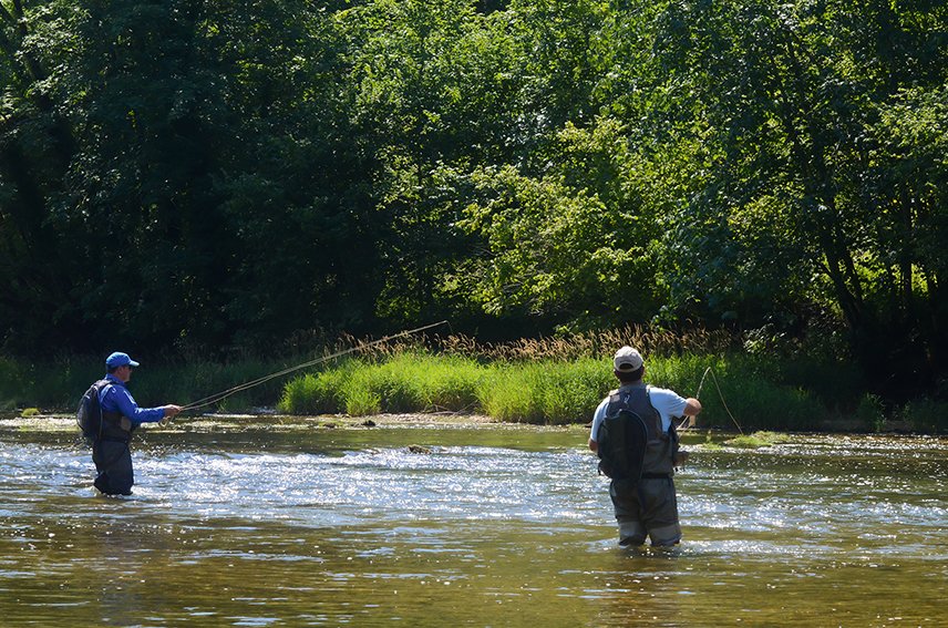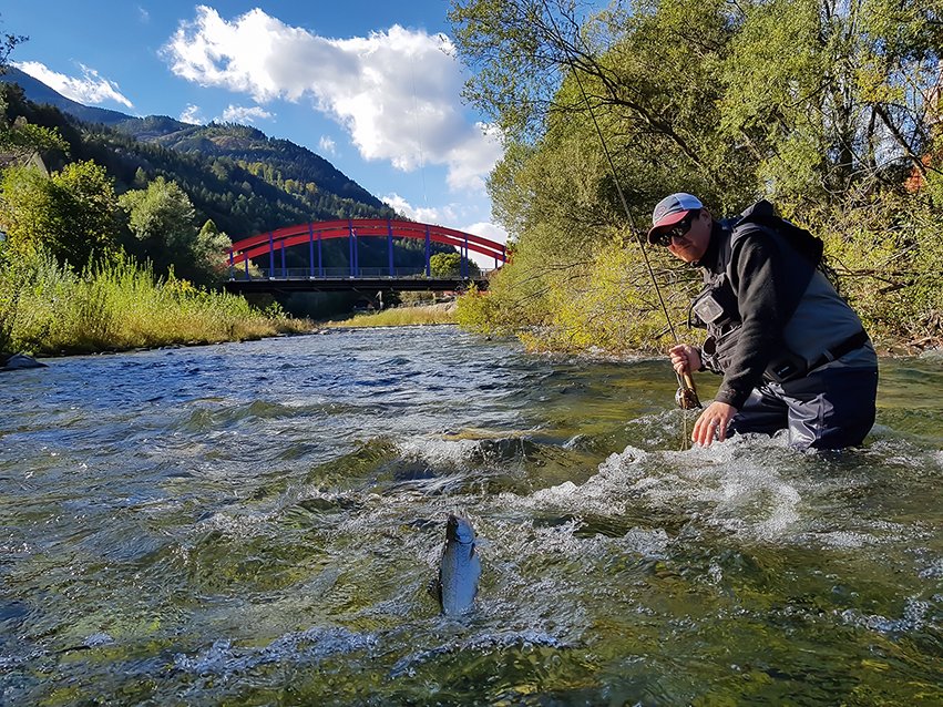 Une truite sauvage ne prendra jamais une mouche qui dérive trop rapidement dans sa lucarne de vision. Le pêcheur doit conduire sa dérive de manière à ralentir le plus possible le mouvement de ses mouches dans la veine d’eau choisie. La touche doit être visuelle, si vous ressentez un toc dans la canne, il y a de fortes chances que le poisson soit déjà parti. C’est pour cette raison que la touche doit se visualiser sur une tension de la boucle de soie formée entre la pointe du scion de votre canne et la surface. Le geste du ferrage doit être ample, mais jamais violent. D’ailleurs, les cannes trop raides en pointe ne sont pas adaptées à cette technique de pêche. Le pêcheur doit parvenir à faire vivre ses imitations le plus longtemps possible afin de déclencher la prise. Il n’est pas question ici de pêche mécanique. En mouche noyée, chaque dérive doit être optimisée afin de réunir le maximum de chance d’avoir une touche. Parfois, il sera bon aussi d’animer légèrement les artificielles par de petits relevés de canne au moment opportun : près d’un obstacle par exemple ou en fin de dérive. Le pêcheur qui cherche les beaux poissons en noyée doit faire fonctionner son instinct, approfondir sa lecture de l’eau qui ne doit pas rester superficielle. C’est sans doute l’une des clés de la réussite dans cette méthode de pêche passionnante.