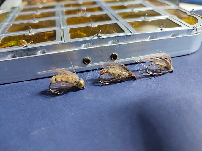 J’aime calquer la couleur de mes artificielles avec le fond de la rivière que je pêche, c’est une méthode qui me réussit bien. Concernant les teintes : le crème, le marron, l’olive, le brun me semblent tout à fait capables de séduire des truites dans un très grand nombre de situations. Mes matériaux de montage sont avant tout naturels et vivants. Les plumes de flanc de cane, de perdrix, les fibres de paonne, de faisan et les dubbings de lièvre naturels ou teints dans les tons précités sont de loin les plus efficaces à l’ouverture. Montez ces mouches en tailles 12 et 10, ce sera parfait pour le jour J dans des eaux tendues. Côté matériel, un ensemble constitué d’une canne de 9 ou 10’ soie de 5, d’un moulinet large arbor, d’une soie flottante WF5 et d’un portefeuille de polyleaders en différentes densités sera l’idéal. Prenez pointe et potences en 16 ou 18 centièmes fluorocarbone. Le polyleader sera simplement raccordé boucle dans boucle avec la soie.