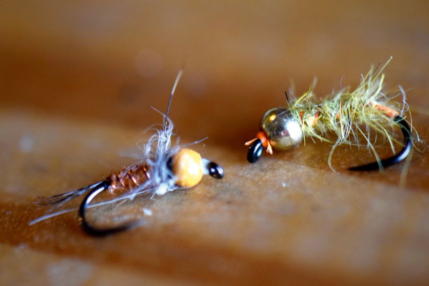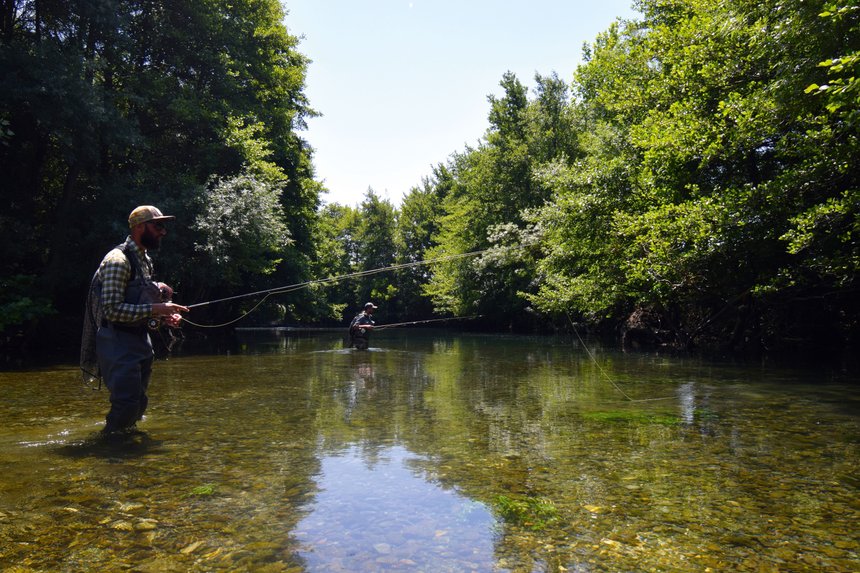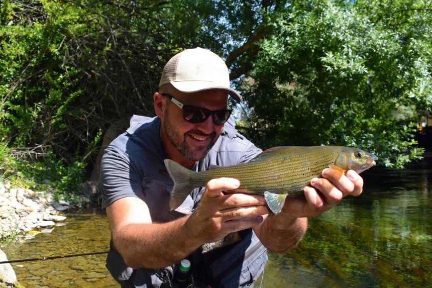 Il aperçoit très vite un gobage qu’il estime être sur une exuvie d’Ephemera Danica et noue l’une de ses imitations à sa pointe en 10 centièmes. Première dérive 3/4 aval et un bécard vient crever la surface, c’est pendu ! Notre ami se jette littéralement à l’eau à la descente pour contrer les puissants démarrages de ce poisson. Au bout d’un certain temps, il nous présente une belle zébrée méditerranéenne d’environ 45 centimètres avant de la remettre promptement à l’eau. Un coup de ligne on ne peut plus parfait. C’est plus en amont qu’avec Bastien nous décidons de nous mettre à l’eau pour tenter de beaux thymallus bien visibles. Nous démarrons avec la même artificielle que celle utilisée par Hugo précédemment, mais nous essuyons plusieurs refus et décrochons un poisson. Plus haut, notre guide rentre trois poissons et vient nous retrouver quelques minutes plus tard pour nous donner la « nymphe miracle » du moment : un petit casque d’or corps vert tag orange. Grâce à ça, Bastien prendra un beau spécimen aux reflets orangés et bleutés. Le temps passe vite en bonne compagnie et c’est déjà midi. Nous regagnons alors le restaurant Le Pescador au « partage des eaux » afin d’y déguster un bon repas et de faire le point sur notre matinée.
