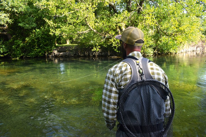 Une fois garés, nous nous équipons. Hugo nous raconte quelques anecdotes de guidages et nous partons à la pêche. Jusque-là, Bastien et moi n’avions pas eu beaucoup d’occasions de pêcher la Sorgue et, sur ses rives, nous restons bluffés par sa clarté et son calme apparent. Ça change de nos rivières de montagne ! Après quelques pas, Hugo nous montre plusieurs ombres postés de taille moyenne. En bon guide, il nous demande si l’on souhaite les attaquer, mais je lui laisse ce plaisir. Il noue alors une petite nymphe foncée ornée de la fameuse bille « chocolat ». Au second passage, c’est la touche, mais après deux ou trois rushs, ce premier poisson lui fausse compagnie. Fait obsolète, puisque notre guide s’attaque rapidement au second qui rejoindra l’épuisette dans la foulée. Une petite photo rapide et notre partenaire de jeu retrouve son élément. Nous continuons d’observer Hugo en action.