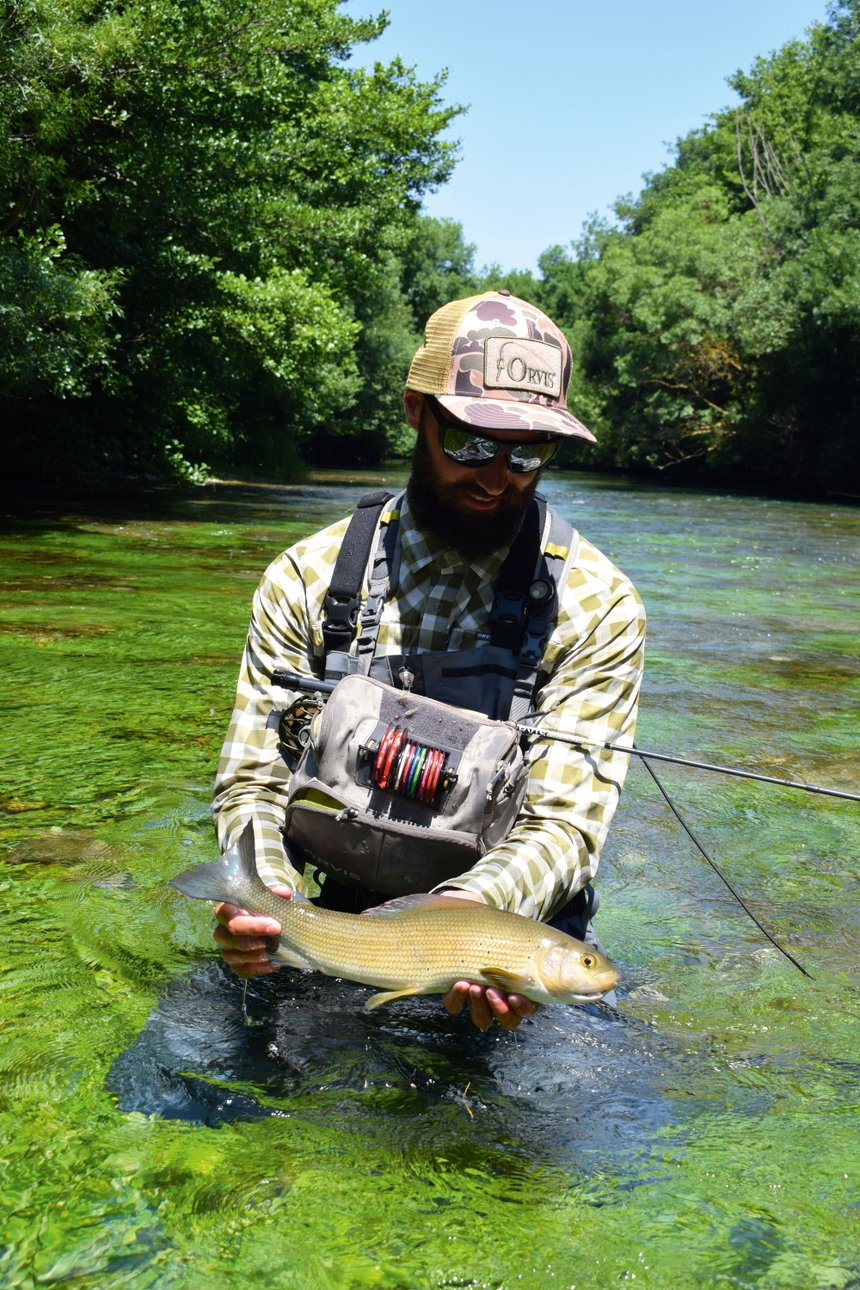 Bastien et moi quittons nos montagnes tôt le matin un jeudi de juin, de manière à être à L’Isle-sur-la-Sorgue aux alentours de 8h. Une fois arrivés, nous retrouvons Hugo Gallinaro sur le parking du magasin Sorguett (merci d’ailleurs à Julien pour la garde de la voiture…). Hugo Gallinaro a passé son BP JEPS « Pêche de loisir » en 2019 dans le but de proposer des prestations sur cette rivière et en Espagne… Notre « barbu » nous explique le programme et la tendance du moment. Même si la technique du jour reste la pêche des ombres en sèche et en nymphe à vue, il évoque la possibilité de prendre quelques truites en sèche sur des imitations de mouche de mai. En effet, nous sommes à la fin de la période d’émergence de ces insectes, nous croisons donc les doigts pour que quelques poissons sympathiques pointent leurs museaux en surface. Nous nous mettons également d’accord sur les mouches et le matériel à avoir pour pêcher efficacement ce type de cours d’eau. Après quelques petits réglages, nous prenons la route avec notre guide vers le premier parcours…