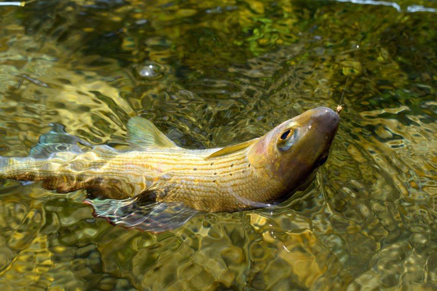 Rassasiés, nous suivons notre moucheur sur un parcours près du restaurant. Nous restons alors surpris par la belle population d’ombres communs de tailles petite à moyenne qui occupe ce bras de Sorgue. Ici, presque chaque dérive plein aval est récompensée par une prise. Nous ne comptons plus les poissons et, malgré leur taille modeste, nous prenons un plaisir fou à les leurrer à vue. En continuant notre descente, Hugo nous fait découvrir une zone qu’il connait encore manifestement bien. Il nous annonce la présence de quelques ombres de taille correcte. Nous confirmons ses dires, puisque deux sujets entre 40 et 50 cm environ s’y nourrissent activement. Je m’empresse d’attaquer le premier poisson avec la nymphe casque d’or de la fin de matinée. À la première dérive, rien ne se passe ; à la seconde, j’aperçois un léger décalage à droite du premier poisson, mais il refuse ma mouche. Je décide alors de rapprocher un peu plus ma canne de l’eau et à la troisième dérive c’est le second poisson qui la prend, je ne veux pas le perdre et penche alors ma canne sur le côté pour éviter une rencontre entre le poisson et l’embâcle. L’ombre dévie alors de sa trajectoire et, après quelques coups de tête, se laisse capturer. Épuisette dans l’eau, je l’observe quelques secondes… Il n’y a pas de doute, cette espèce est bien ma préférée, même si c’est sûrement celle que je côtoie le moins. Dominant parfaitement son sujet, Hugo n’aura pas de mal à prendre le deuxième poisson qui frôlera les cinquante centimètres. Une petite photo rapide dans l’eau et c’est déjà l’heure du retour.