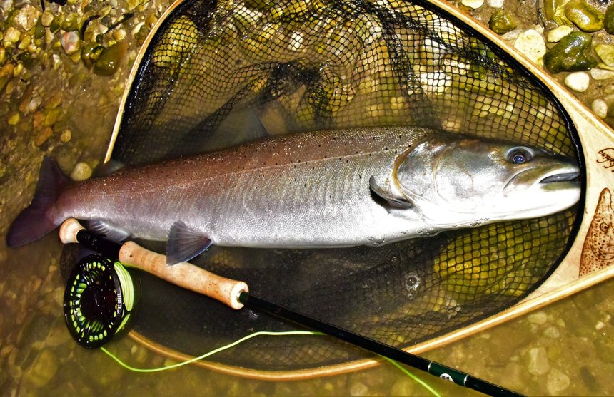 Je redescends de quelques pas et recommence mes roulés avec mon imitation de petite arc-en-ciel. Alors que je strippe lentement, la soie se tend à nouveau et je ferre énergiquement. Un monstrueux remous se forme en surface. Jean-Paul, qui est en hauteur sur la berge, me crie : « il est énorme » ! Je tire sur ma soie et fais monter effectivement un des plus gros salmonidés que je n’ai jamais vus. Ce huchon dépasse allégrement le mètre et il se met à rouler sur lui-même. Je suis bien tendu mais ne sais trop quoi faire. Il n’est qu’à une dizaine de mètres de moi et ne démarre pas. Tout à coup, la soie se détend, c’est fini l’animal a réussi à se décrocher… ! Des amis guides me diront plus tard que, dans ce cas, il faut tirer comme un ours sur la ligne pour tracter le gros salmonidé et le forcer à se battre vraiment. Bon, j’ai failli faire deux magnifiques poissons en cinq lancers, dont un véritable trophée, alors que lors des cinq cents lancers précédents, je n’ai pas eu une touche !