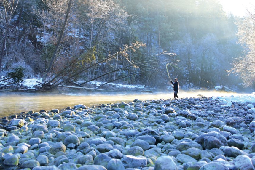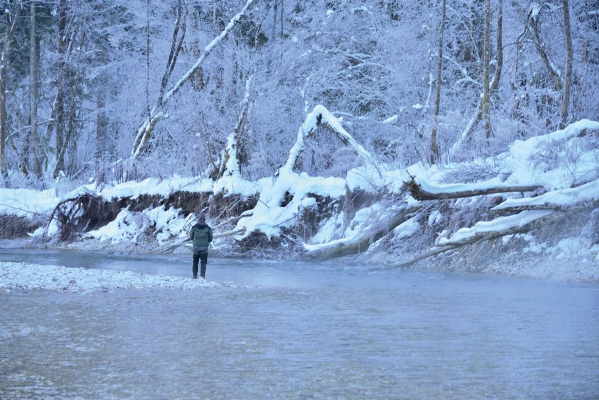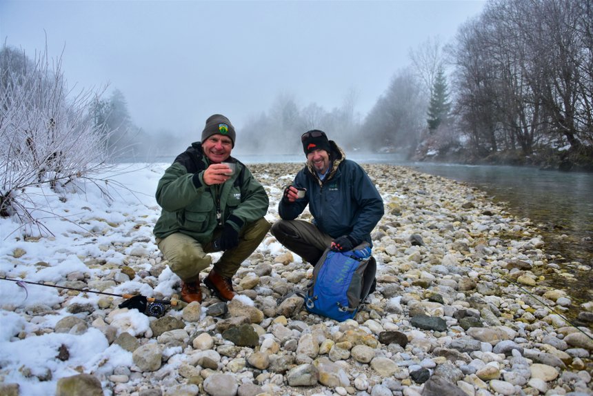 Avant ce séjour, mes amis guides locaux m’ont prévenu, cela va être difficile, il ne faut pas craindre le froid, la neige, le vent et la bredouille ! Pour notre première journée, nous commençons par la société de pêche de Mozirje qui gère la partie médiane de la Savinja. Nous rencontrons notre guide Mirko Skafar un compétiteur reconnu au niveau international, un très bon monteur de mouches, et de cannes, qu’il vend sur son site internet. Il faut savoir que les premières lueurs du jour comme les dernières sont les moments les plus importants de la journée pour un pêcheur de huchon. Je pense que la majorité des captures se font dans ces quelques minutes entre chiens et loups…