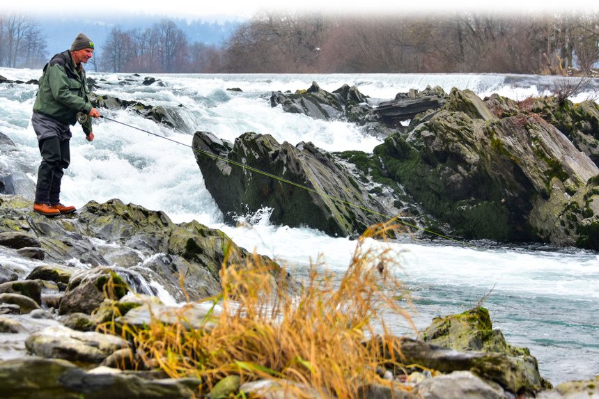 Sur un autre spot Luka s’immobilise tout à coup et nous appelle. Au milieu d’un lisse, juste devant un gros caillou, sont postés deux saumons du Danube. L’un fait largement plus d’un mètre. Le matériel est vérifié et Luka guide Jean-Paul qui va se placer une quinzaine de mètres en amont. Il allonge progressivement les lancers, toujours en déposant sa mouche proche de la berge d’en face, pour effectuer un arc de cercle et passer juste devant les prédateurs. Au troisième passage, la distance est bonne et Luka dit à Jean-Paul de se tenir prêt. Depuis la rive, nous voyons parfaitement le grand tube fly blanc évoluer dans l’eau limpide. Alors que l’artificielle accélère, entraînée par la soie, le plus gros des deux poissons part derrière. Le huchon se colle au streamer. Nous avons une sacrée montée d’adrénaline et j’attends l’attaque à tout moment. Il va suivre sur plusieurs mètres, avant de disparaître dans son trou… Nous ne baissons pas les bras et essayons ensuite sous un barrage. Luka guide Jean-Paul dans le pool qui se forme en aval de l’ouvrage. Il me dit que je peux essayer de passer sur le mur et faire quelques lancers dans la chute. Je crapahute pour me retrouver juste au-dessus du déversoir principal. Une grosse baignoire profonde se forme ici. Je lance donc à quelques mètres de moi et laisse couler ma mouche dans l’eau blanche. Je suis en surplomb et baisse ma canne au maximum pour résorber le ventre dans la soie. Je sens mon streamer travailler et le laisse être porté par le courant quelques secondes avant de l’animer. J’arrive alors juste sous la chute mon tandem apparaît en surface et, tout d’un coup, un gros huchon à la queue rouge surgit entièrement hors de l’eau pour avaler ma mouche ! Je suis surpris mais ferre comme je peux et le tiens une seconde avant qu’il ne se décroche ! J’ai toujours la vision de ce poisson à la caudale rougeoyante faisant une véritable chandelle juste sous ma canne… J’avoue avoir contracté le virus de cette pêche et je rêve des plus gros poissons que j’ai vus, tenus, ou perdus… J’espère reprendre ma quête hivernale dès cette année, avec un peu plus d’expérience mais toujours beaucoup d’humilité par rapport au seigneur des rivières slovènes.