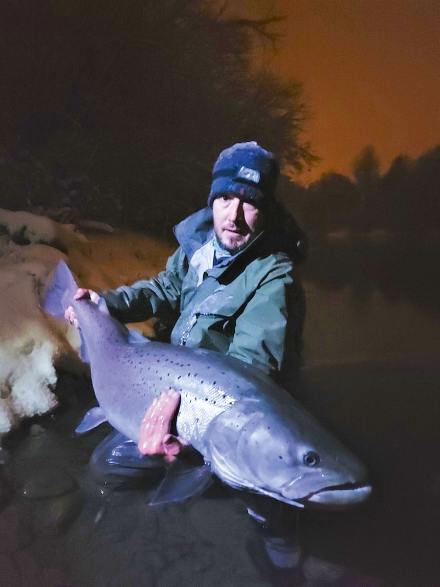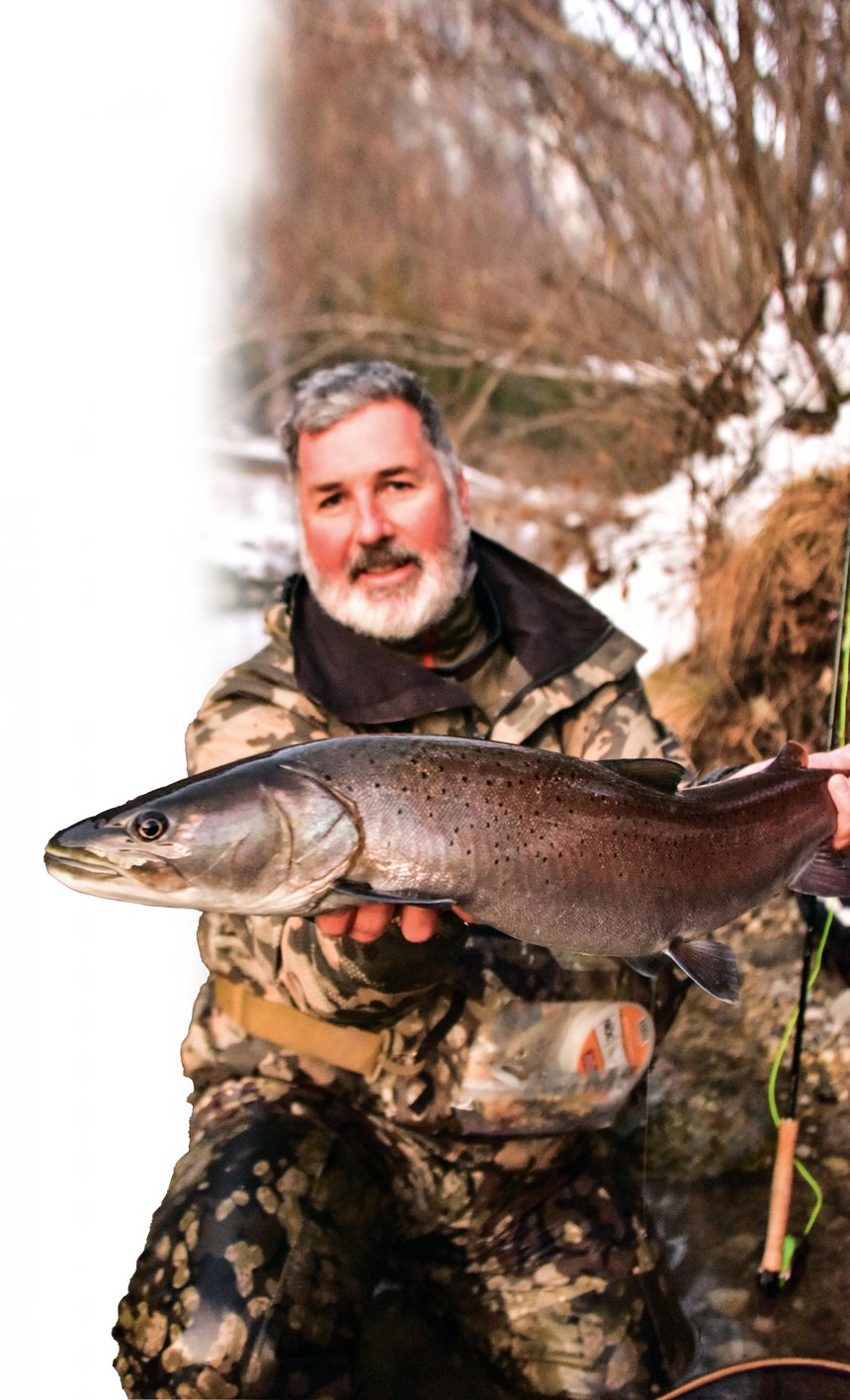 La cuisine est bonne, en Slovénie, et cela nous permet de garder le moral ! Le jour suivant nous sommes sur la Sava Bohinjka en amont de Bled, une partie gérée par l’Institut de la pêche slovène. Étant un des meilleurs secteurs, il est très fréquenté et les principaux pools sont pêchés quasi quotidiennement. Nous descendons le cours d’eau, dans un paysage hivernal de carte postale. Vers midi, sous un beau soleil, nous remontons vers un pont que nous avait indiqué le garde. Sur le lisse peu profond, il y a des dizaines de truites qui bronzent, profitant des heures les plus chaudes de la journée. Je n’en avais pas vu une seule le matin ! Jean-Paul rentre en premier dans l’eau alors que je vais un peu plus haut et aperçois nettement un huchon placé juste devant son rocher. Le problème est que je suis obligé de m’avancer pour lancer. Je décide de changer de moulinet et passe sur une soie flottante avec juste une petite tête plongeante type six. Le courant est faible, la profondeur n’excède pas deux mètres et je choisis aussi de mettre une autre mouche. J’ai une imitation assez réaliste de petite truite arc-en-ciel d’une bonne quinzaine de centimètres, pourquoi pas après tout ! Ce nouvel ensemble plus léger me permet d’atteindre l’autre rive en roulé. Je ne vois plus le gros salmonidé repéré mais allonge progressivement la soie. Au moment où mon streamer passe au milieu du pool, j’ai une forte tirée et plus rien ! J’ai encore ferré dans le vide, je suis dégoûté… La lumière déclinant, je décide de revenir sur le poste où j’ai eu la touche. Je fais, à quelques centimètres près, la même dérive qu’il y a trois heures. J’ai une nouvelle attaque ! Cette fois, le poisson est piqué et je mets la pression pour l’écarter des rochers. Heureusement, j’ai amené une grande épuisette car je suis seul et j’avoue transpirer un peu lorsque le huchon commence à se tortiller dans tous les sens en surface. Je fonce dessus et réussis à le mettre au fond du filet ! La tension tombe et j’admire un joli poisson d’environ quatre-vingts centimètres, ce qui reste modeste pour l’espèce. Mais quel soulagement d’en tenir enfin un dans les mains ! Lorsque je le prends dans l’épuisette, il se décroche ! Il s’en est fallu de peu, encore une fois ! J’ai un pressentiment il faut faire encore quelques lancers ici avant la fin de l’heure légale de pêche.