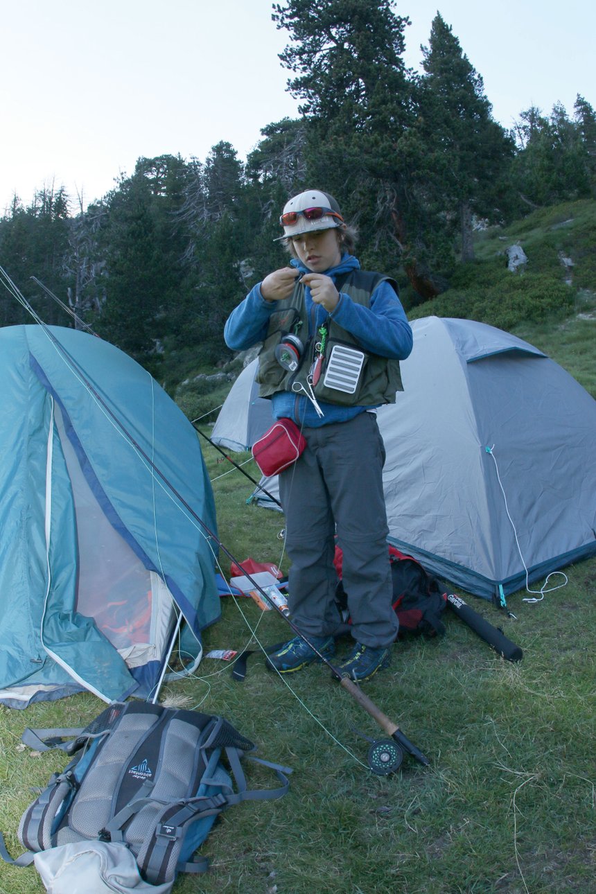 Malgré son jeune âge Thoma a très vite manifesté l’envie de réaliser ses propres mouches, le travail à l’étau débute pour ce moucheur en herbe. La pêche à la mouche est dans toutes ses pensées, très enthousiaste et débordant d’énergie il remplit ses boîtes avec ses propres créations. Prendre des truites avec ses mouches de fabrication maison est l’évolution logique d’un moucheur passionné, Thoma nourrit patiemment son rêve de piquer une belle truite avec ses créations. Toutes les occasions sont bonnes pour sortir la canne à mouche, ses parents l’ont bien compris et font tout ce qu’ils peuvent pour satisfaire cet infatigable pêcheur. Son papa, guide de montagne et pisteur secouriste, emmène Thoma découvrir quelques lieux privilégiés dans les montagnes Pyrénéennes. Cette expérience précieuse aide le jeune Tarbais à grandir dans son sport qui reste exigeant dans cette région au fort relief. Chaque période de vacances scolaires, sa famille lui permet de vivre pleinement sa passion en lui offrant la chance de pouvoir participer aux camps de pêche organisés par Olivier Malo dans ses montagnes natales. Un terrain de jeu familier pour Thoma qui est dans son élément quand il faut pêcher les torrents ou lacs de montagnes. Pouvoir partager ces moments avec un pêcheur d’expérience comme Olivier fait grandir Thoma dans sa pratique de la pêche à la mouche, d’autant plus qu’il y met une énergie incroyable. Cette ferveur que tout pêcheur a pu connaître étant jeune lorsqu’une journée de pêche arrive, la nuit blanche, les yeux grands ouverts, surexcité, à penser pêche en attendant la sonnerie grinçante du réveil. Une impatience qui s’estompe avec l’âge et l’expérience mais qui est essentielle à cet âge-là.