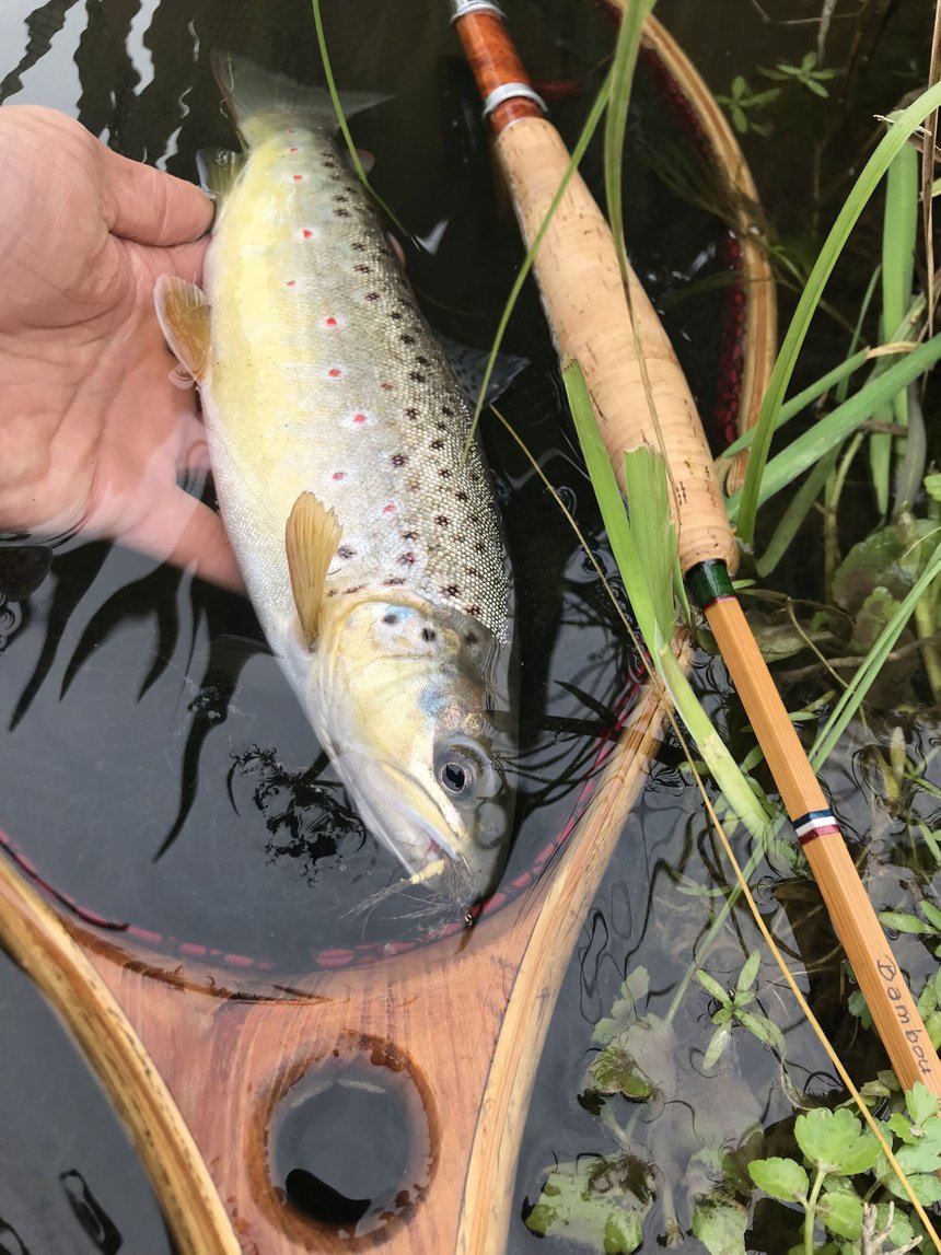 Il a plu cette nuit et l’eau s’est piquée. Xavier décide de se rendre sur « sa » rivière qu’en début d’après-midi en espérant une éclaircie annoncée pour les prochaines heures. « Hier en fin de journée, ce fut un festival. J’ai piqué plusieurs beaux poissons en sèche. Sur cette rivière, au-dessus de 30, c’est déjà une très jolie truite, une 40 est un poisson trophée. Elles étaient rondes comme des ballons de rugby. Autant dire que l’activité bat son plein depuis quelques jours. Je ne sais pas encore si l’eau teintée va interrompre le cycle d’éclosion ou caler les truites ? L’air est doux et le niveau semble être resté stable. Tous les espoirs sont permis » s’interroge Xavier tout en vérifiiant sa pointe en 18 centièmes. Rien ne sert de finasser selon lui. Le milieu est encombré, les truites combatives. Mieux vaut soigner la qualité de la présentation. « Mon choix se porte sur un bas de ligne à nœud. J’utilise une soie naturelle de 4, donc le premier brin sera en 40 centièmes. Je fais ensuite une dégressivité jusqu’aux 20 centièmes, de 10 cm à chaque fois. L’élément le plus important est ensuite la porte-pointe, d’une longueur de 50 cm, ce qui casse la dégressivité et sert d’amortisseur pour la pointe, proprement dite, 1 m environ, en descendant rarement en dessous de 16 centièmes. C’est un câble de précision et l’utiliser à l’arbalète avec ou sans la soie est redoutable. Pour une pratique en subsurface ou en nymphe, il m’arrive d’allonger alors la pointe. Mon bas de ligne n’excède pas 2,50 m en accord avec ma canne courte de 6 pieds » précise Xavier qui pour l’instant observe des cohortes de mouches de mai qui sont posées sur la végétation rivulaire. Pour l’heure, pas d’activité sur l’eau.
