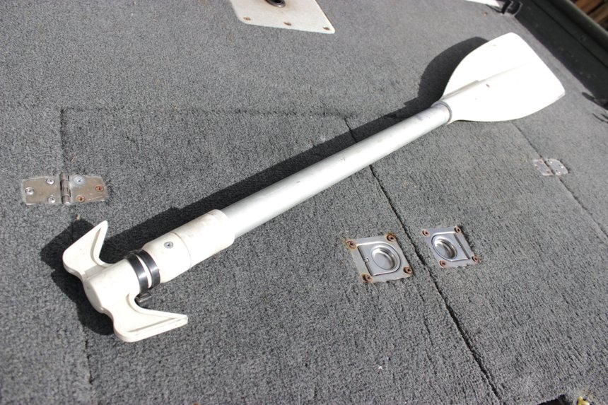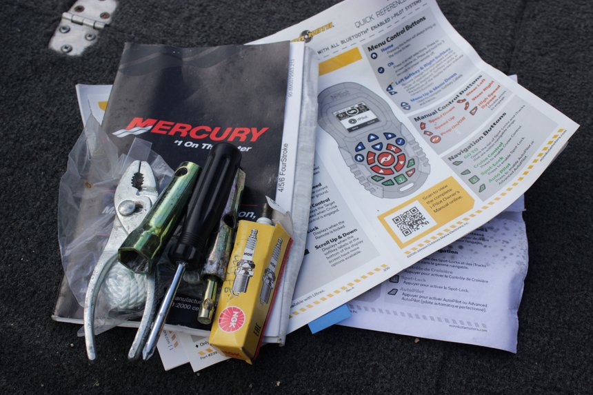 Être prévoyant n’est pas un vice, mais à trop l’être on finit par devenir pessimiste et on s’encombre d’objets pour la plupart inutiles. Pas la peine d’embarquer une caisse à outils complète qui sera plus encombrante qu’autre chose. Pour autant, emportez certains équipements plus basiques, comme un cordage. Outre qu’il est obligatoire, il vous évitera bien des déboires. Achetez une hélice de secours pour le moteur électrique en cas de perte ou de casse. Ceci ne vous évitera pas la galère du thermique en panne, mais au moins vous pourrez continuer de pêcher. Prévoyez une ou plusieurs bougies neuves, de même que la clé à bougie, la notice et le cordon de secours pour démarrer votre thermique. Une petite trousse à outils garnie de quelques outils indispensables, un petit jerrican d’essence de secours et une bombe de nettoyant contact sont à 4 5 posséder dans l’un de ses coffres, avec des piles, si jamais celle de la télécommande lâche. Une petite pagaie pliante, elle aussi obligatoire sur certains bateaux, n’est pas de trop. Peu encombrante, elle sera votre ultime recours en cas de panne générale.